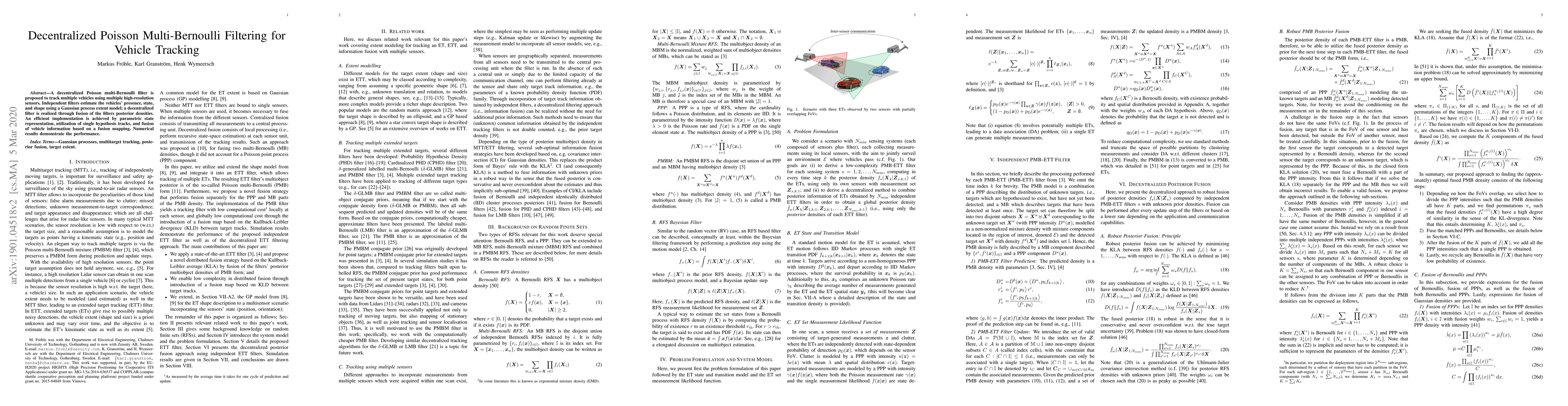 This paper proposes a decentralized Poisson multi-Bernoulli filter for tracking multiple vehicles using multiple high-resolution sensors. The method employs independent filters for estimating vehicle presence, state, and shape, with efficient implementation through parametric state representation and fusion of vehicle information.