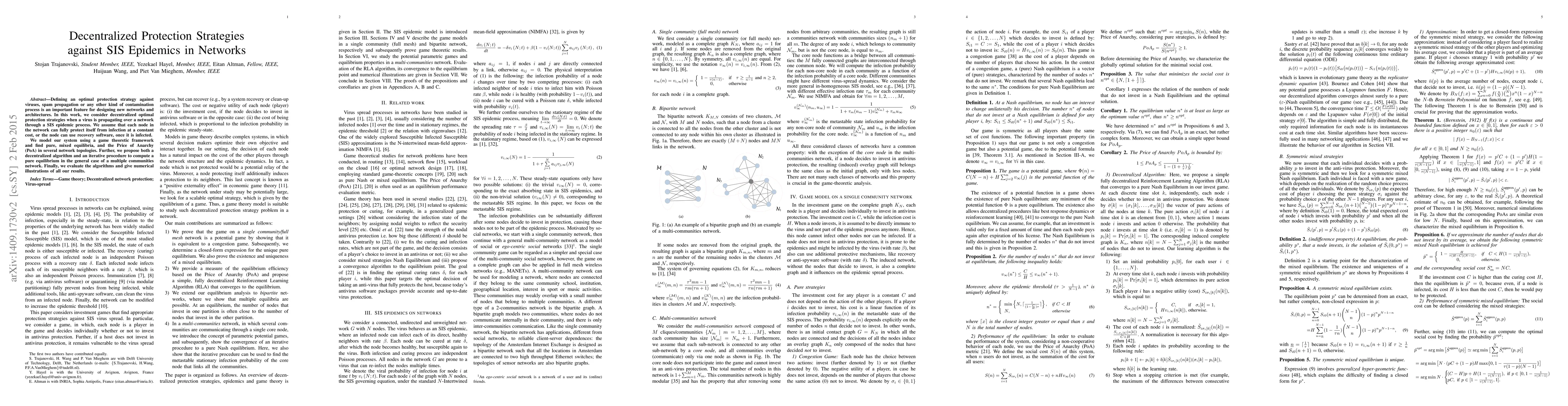 This paper explores decentralized strategies for protecting networks against SIS epidemics, modeling the problem using game theory to find optimal equilibria and the Price of Anarchy. It proposes algorithms for computing equilibria in multi-community networks and evaluates them numerically.