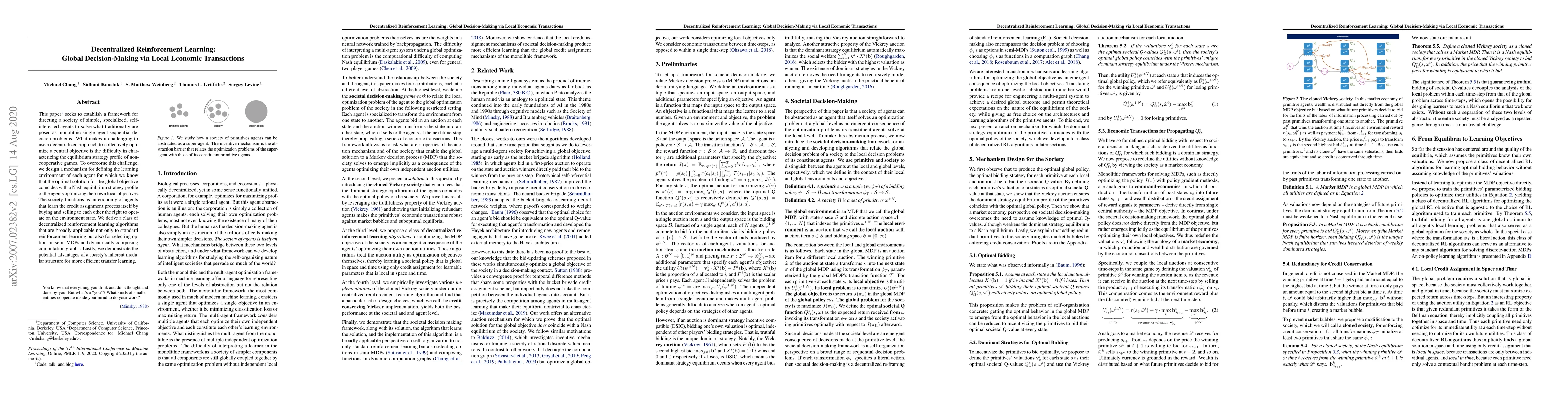 Researchers develop a framework for decentralized reinforcement learning, allowing individual agents to collectively solve complex problems through local economic transactions. The approach enables efficient transfer learning and is broadly applicable to various reinforcement learning scenarios.