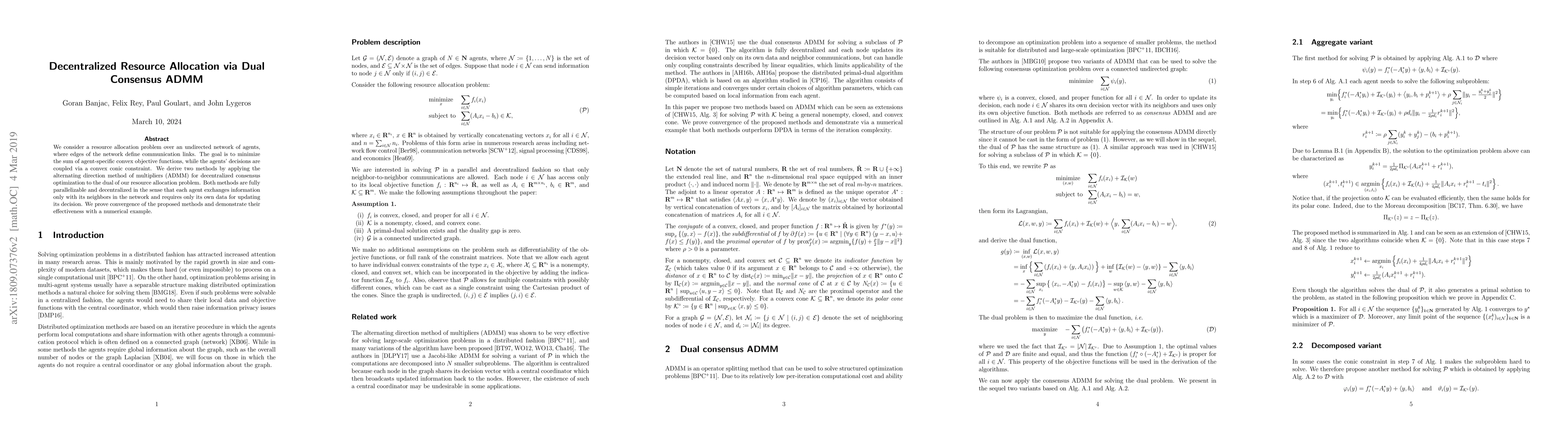 This paper presents decentralized resource allocation methods using dual consensus ADMM, enabling parallelizable and localized optimization over network agents. The proposed methods ensure convergence and are demonstrated effective via numerical examples.