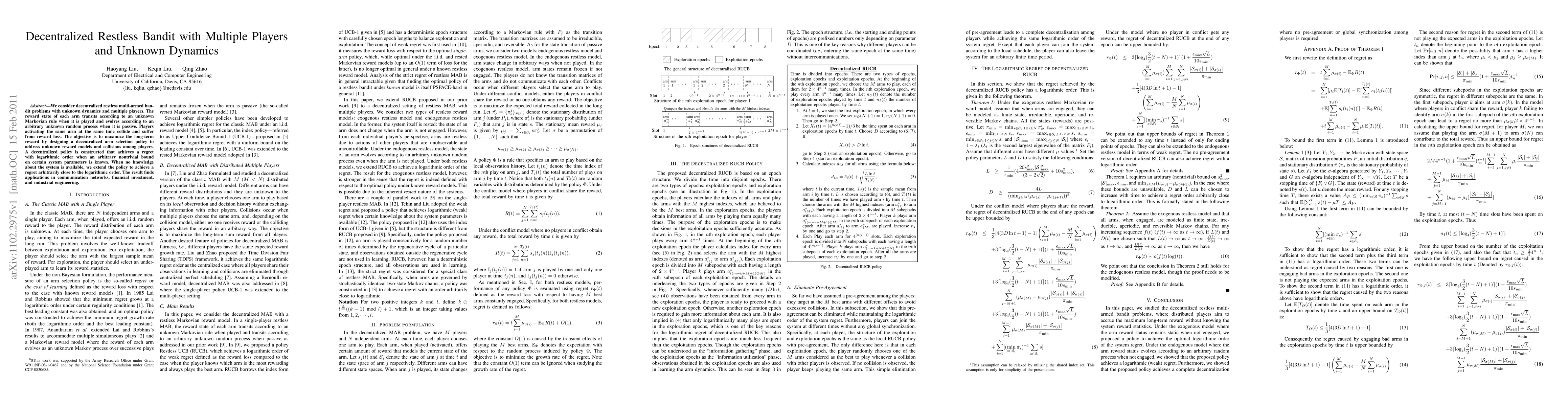 This paper proposes decentralized policies for multi-armed bandit problems with unknown dynamics and player collisions. It achieves logarithmic regret bounds under known parameter bounds and near-logarithmic regret without such knowledge, applicable to fields like communication networks and financial investment.