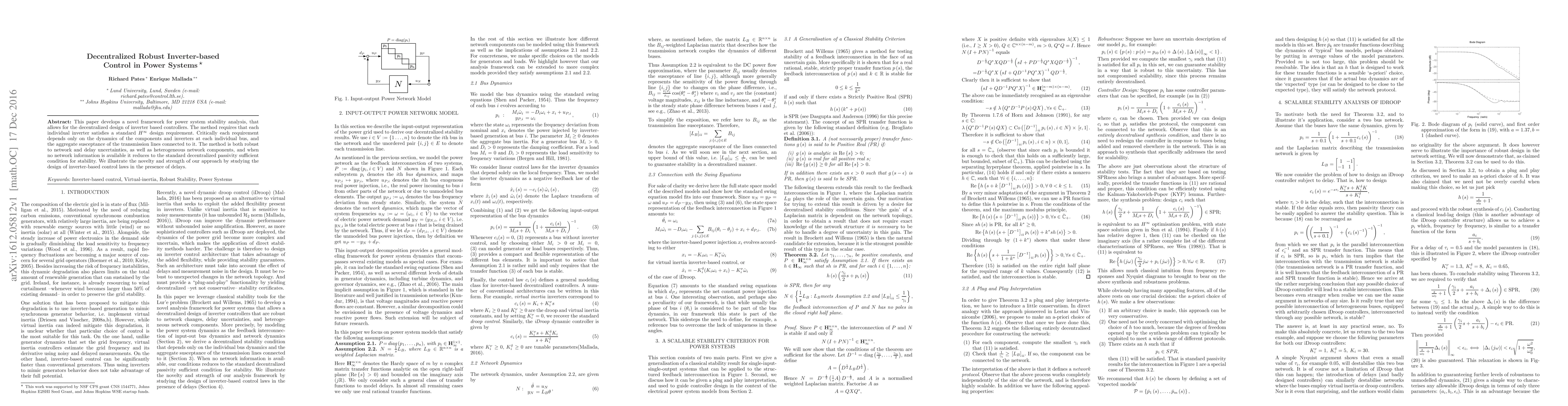 This paper develops a novel framework for power system stability analysis, that allows for the decentralized design of inverter based controllers. The method requires that each individual inverter satisfies a standard $H^\infty$ design requirement. Critically each requirement depends only on the dynamics of the components and inverters at each individual bus and the aggregate susceptance of the transmission lines connected to it. The method is both robust to network and delay uncertainties, as well as heterogeneous network components, and when no network information is available it reduces to the standard decentralized passivity sufficient condition for stability. We illustrate the novelty and strength of our approach by studying the design of inverter-based control laws in the presence of delays.