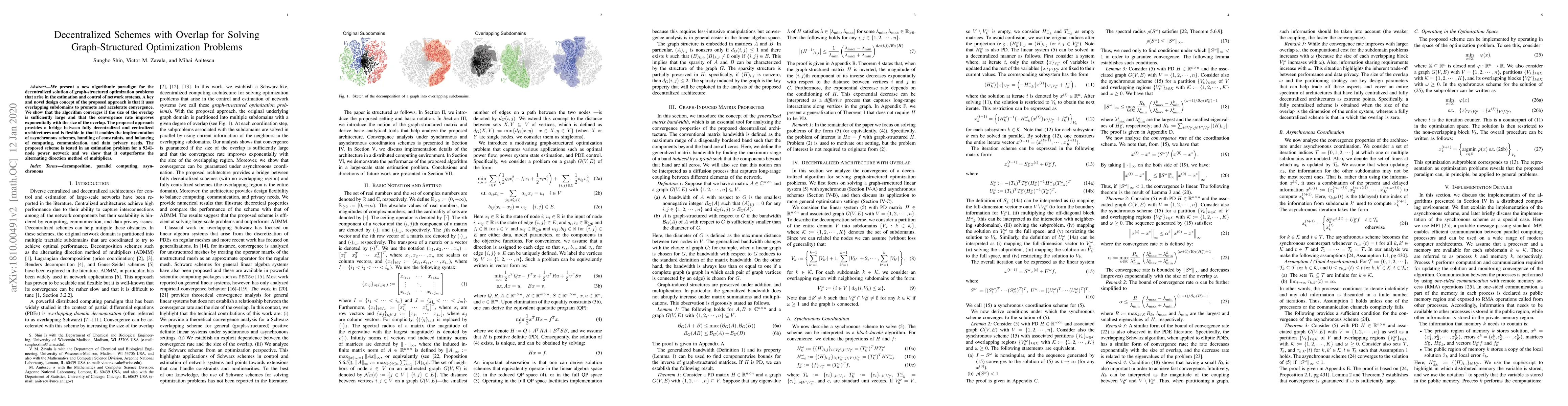 We present a new algorithmic paradigm for the decentralized solution of graph-structured optimization problems that arise in the estimation and control of network systems. A key and novel design concept of the proposed approach is that it uses overlapping subdomains to promote and accelerate convergence. We show that the algorithm converges if the size of the overlap is sufficiently large and that the convergence rate improves exponentially with the size of the overlap. The proposed approach provides a bridge between fully decentralized and centralized architectures and is flexible in that it enables the implementation of asynchronous schemes, handling of constraints, and balancing of computing, communication, and data privacy needs. The proposed scheme is tested in an estimation problem for a 9241-node power network and we show that it outperforms the alternating direction method of multipliers.