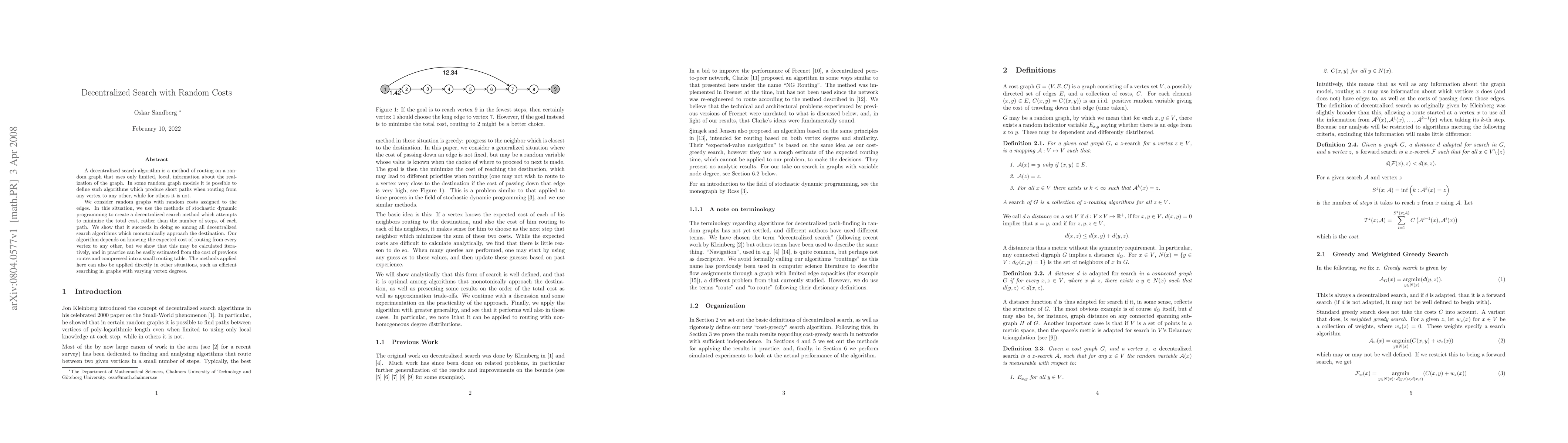 A decentralized search algorithm is proposed to minimize total cost in random graphs with random edge costs, leveraging stochastic dynamic programming and iterative calculation of expected costs.