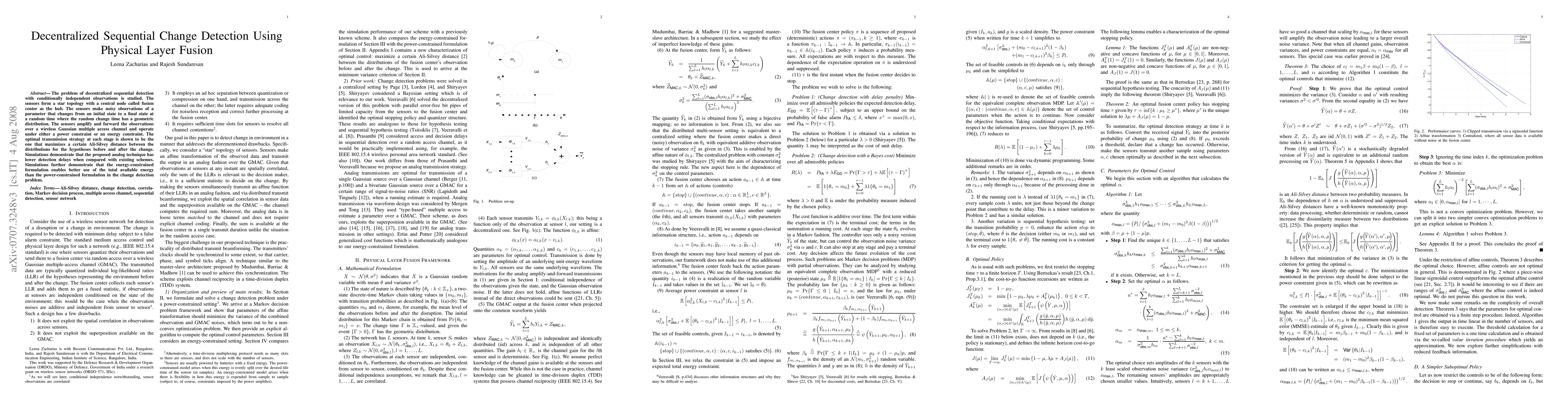 This paper proposes a decentralized sequential change detection method using physical layer fusion in a star topology network. The optimal transmission strategy maximizes an Ali-Silvey distance to minimize detection delays, showing better performance under energy constraints compared to power constraints.