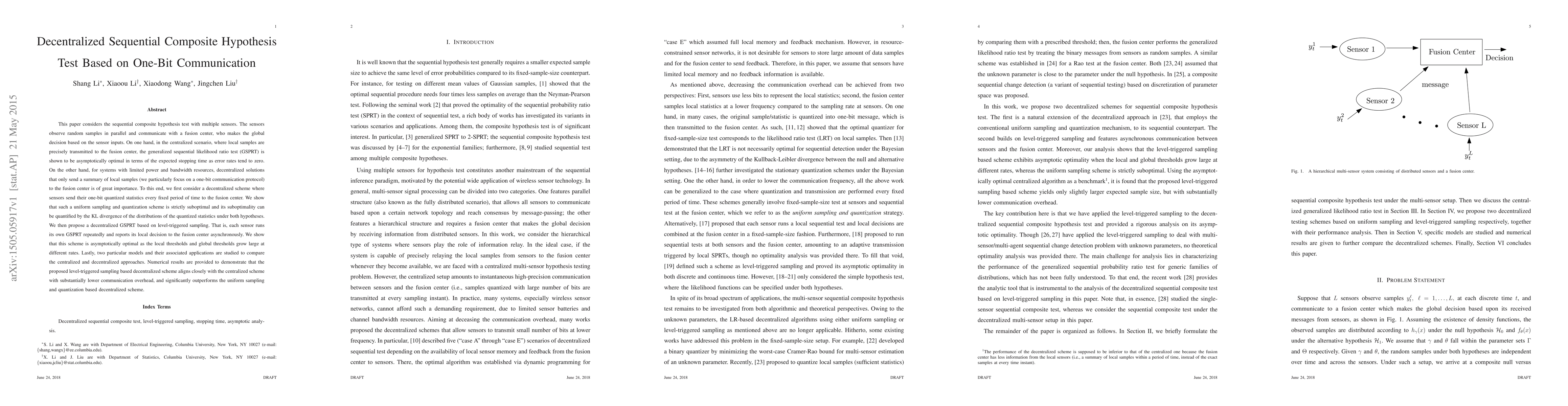 This paper proposes a decentralized sequential composite hypothesis test using one-bit communication, comparing centralized and decentralized approaches. It finds that a uniform sampling and quantization scheme is suboptimal, while a level-triggered sampling approach is asymptotically optimal with lower communication costs.
