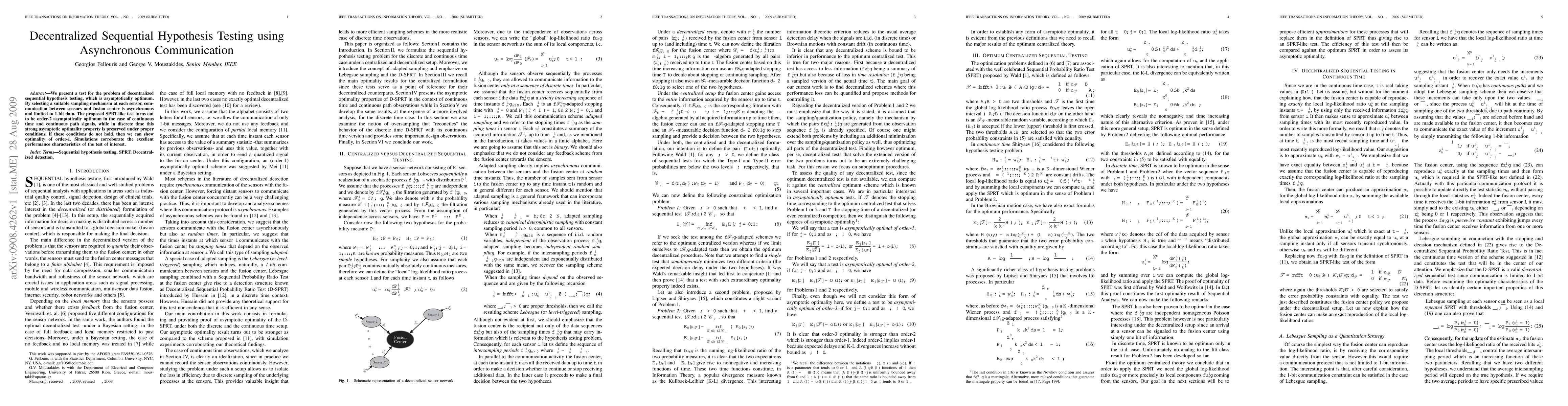 This paper proposes an asymptotically optimum decentralized sequential hypothesis test using asynchronous 1-bit communication between sensors and a fusion center. The SPRT-like test achieves order-2 optimality for continuous signals and order-1 under certain conditions, validated by simulations.