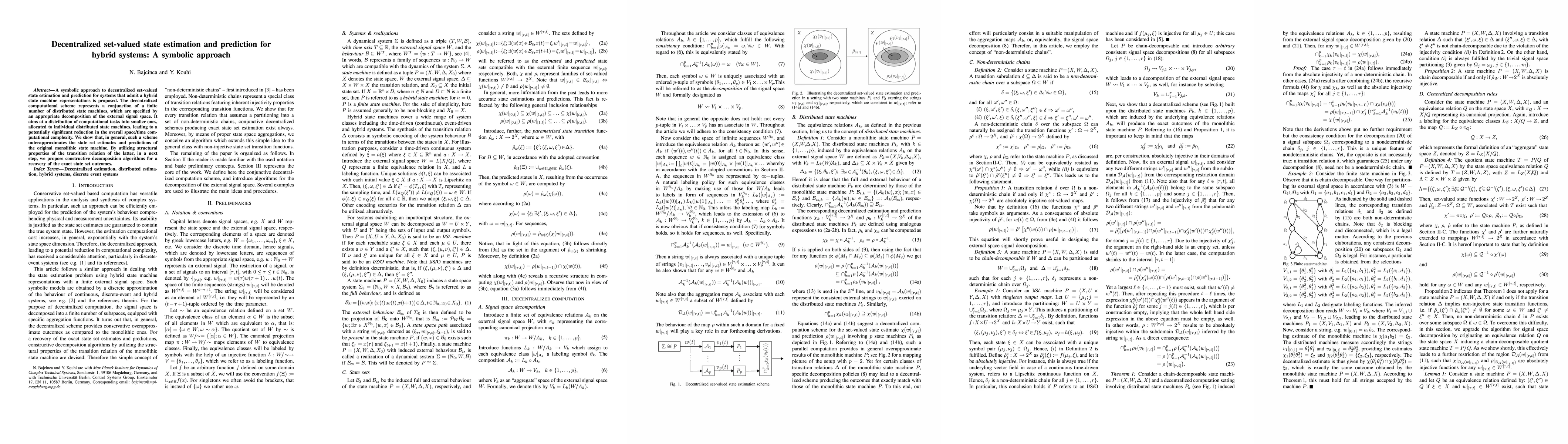 A symbolic approach to decentralized set-valued state estimation and prediction for systems that admit a hybrid state machine representations is proposed. The decentralized computational scheme represents a conj unction of a finite number of distributed state machines, which are specified by an appropriate decomposition of the external signal space. It aims at a distribution of computational tasks into smaller ones, allocated to individual distributed state machines, leading to a potentially significant reduction in the overall space/time computational complexity. We show that, in general, such a scheme outerapproximates the state set estimates and predictions of the original monolithic state machine. By utilizing structural properties of the transition relation of the latter, in a next step, we propose constructive decomposition algorithms for a recovery of the exact state set outcomes.