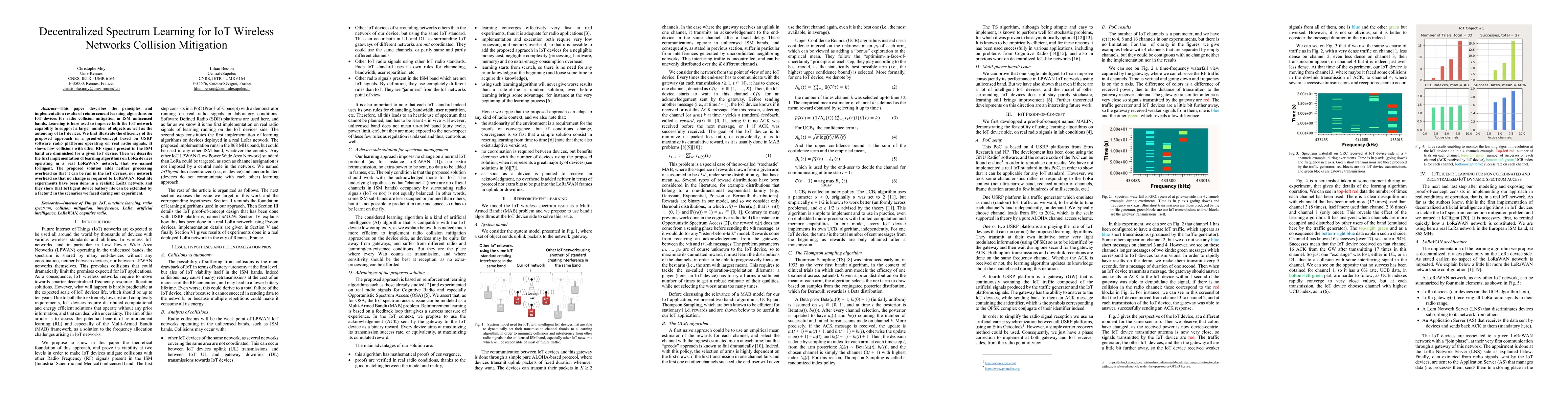 This paper describes the principles and implementation results of reinforcement learning algorithms on IoT devices for radio collision mitigation in ISM unlicensed bands. Learning is here used to improve both the IoT network capability to support a larger number of objects as well as the autonomy of IoT devices. We first illustrate the efficiency of the proposed approach in a proof-of-concept based on USRP software radio platforms operating on real radio signals. It shows how collisions with other RF signals present in the ISM band are diminished for a given IoT device. Then we describe the first implementation of learning algorithms on LoRa devices operating in a real LoRaWAN network, that we named IoTligent. The proposed solution adds neither processing overhead so that it can be ran in the IoT devices, nor network overhead so that no change is required to LoRaWAN. Real life experiments have been done in a realistic LoRa network and they show that IoTligent device battery life can be extended by a factor 2 in the scenarios we faced during our experiment.