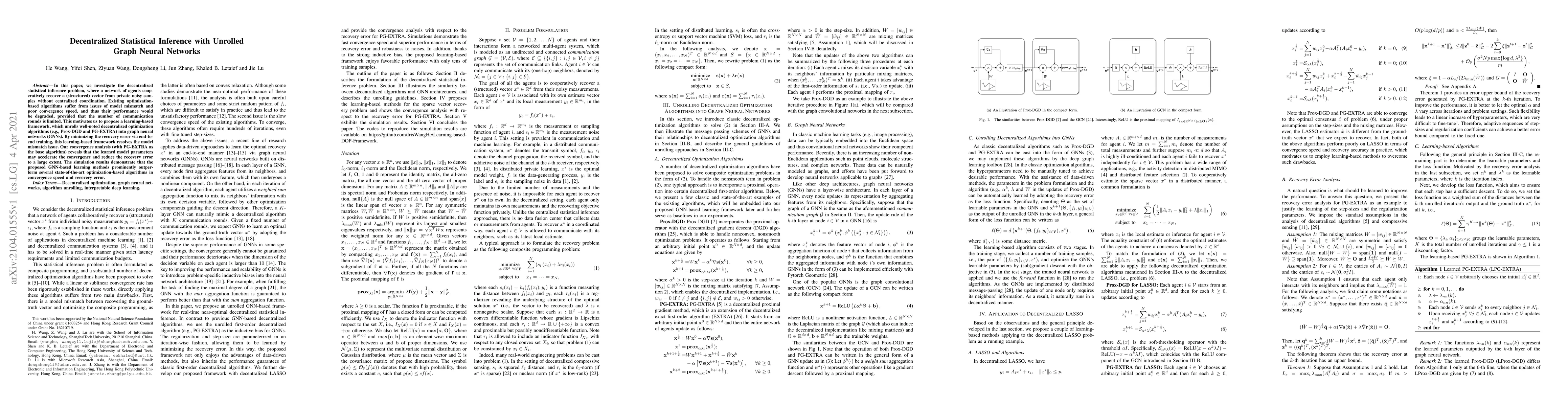 This paper proposes a learning-based framework using unrolled graph neural networks to address decentralized statistical inference, outperforming traditional optimization-based algorithms in convergence speed and recovery error. The framework resolves model mismatch issues and accelerates convergence through end-to-end training.