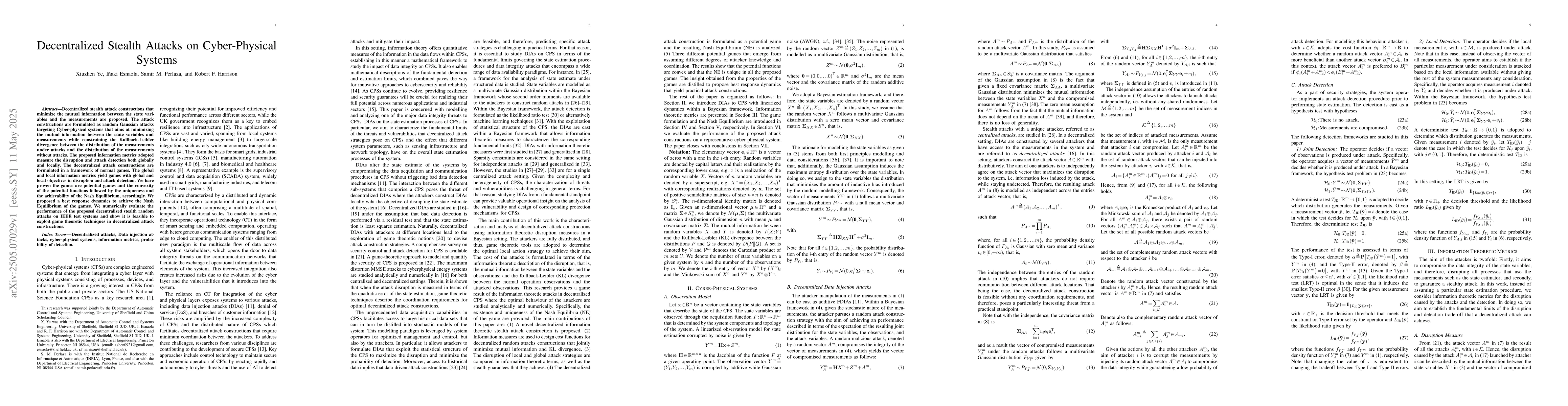 This research paper proposes decentralized stealth attacks on Cyber-Physical Systems that minimize mutual information between state variables and measurements. It shows the feasibility of using game theory to construct these attacks and demonstrates their effectiveness through numerical evaluation.