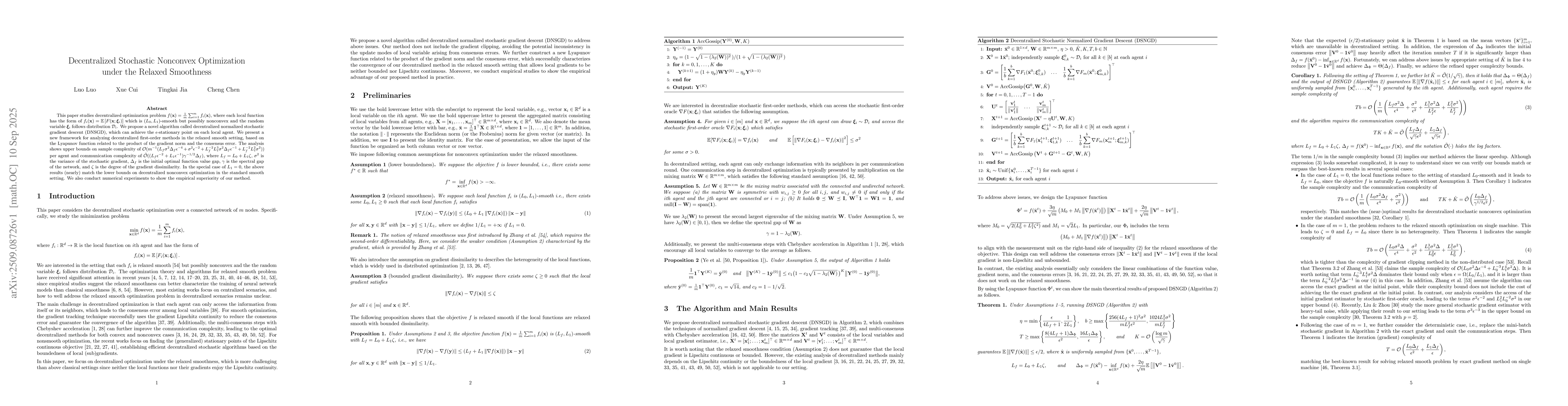 This paper studies decentralized optimization problem $f(\mathbf{x})=\frac{1}{m}\sum_{i=1}^m f_i(\mathbf{x})$, where each local function has the form of $f_i(\mathbf{x}) = {\mathbb E}\left[F(\mathbf{x};{\xi}_i)\right]$ which is $(L_0,L_1)$-smooth but possibly nonconvex and the random variable ${\xi}_i$ follows distribution ${\mathcal D}_i$. We propose a novel algorithm called decentralized normalized stochastic gradient descent (DNSGD), which can achieve the $\epsilon$-stationary point on each local agent. We present a new framework for analyzing decentralized first-order methods in the relaxed smooth setting, based on the Lyapunov function related to the product of the gradient norm and the consensus error. The analysis shows upper bounds on sample complexity of ${\mathcal O}(m^{-1}(L_f\sigma^2\Delta_f\epsilon^{-4} + \sigma^2\epsilon^{-2} + L_f^{-2}L_1^3\sigma^2\Delta_f\epsilon^{-1} + L_f^{-2}L_1^2\sigma^2))$ per agent and communication complexity of $\tilde{\mathcal O}((L_f\epsilon^{-2} + L_1\epsilon^{-1})\gamma^{-1/2}\Delta_f)$, where $L_f=L_0 +L_1\zeta$, $\sigma^2$ is the variance of the stochastic gradient, $\Delta_f$ is the initial optimal function value gap, $\gamma$ is the spectral gap of the network, and $\zeta$ is the degree of the gradient dissimilarity. In the special case of $L_1=0$, the above results (nearly) match the lower bounds on decentralized nonconvex optimization in the standard smooth setting. We also conduct numerical experiments to show the empirical superiority of our method.