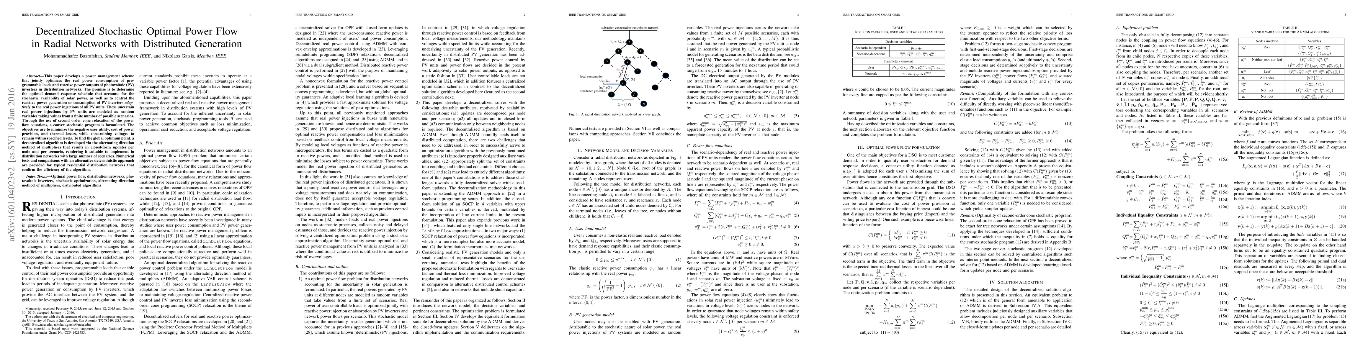 This paper develops a power management scheme that jointly optimizes the real power consumption of programmable loads and reactive power outputs of photovoltaic (PV) inverters in distribution networks. The premise is to determine the optimal demand response schedule that accounts for the stochastic availability of solar power, as well as to control the reactive power generation or consumption of PV inverters adaptively to the real power injections of all PV units. These uncertain real power injections by PV units are modeled as random variables taking values from a finite number of possible scenarios. Through the use of second order cone relaxation of the power flow equations, a convex stochastic program is formulated. The objectives are to minimize the negative user utility, cost of power provision, and thermal losses, while constraining voltages to remain within specified levels. To find the global optimum point, a decentralized algorithm is developed via the alternating direction method of multipliers that results in closed-form updates per node and per scenario, rendering it suitable to implement in distribution networks with large number of scenarios. Numerical tests and comparisons with an alternative deterministic approach are provided for typical residential distribution networks that confirm the efficiency of the algorithm.