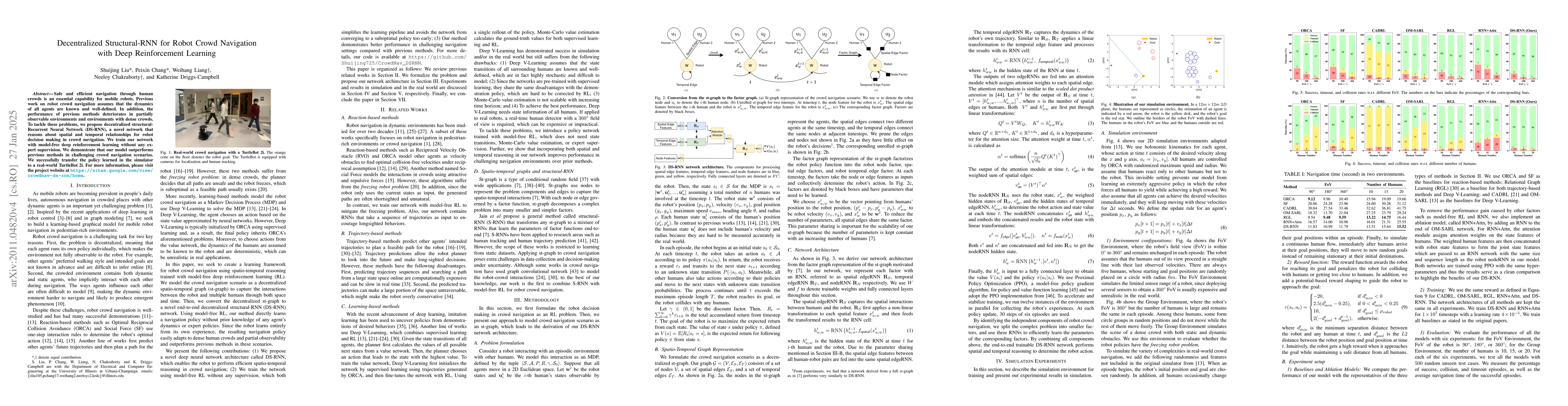 This paper proposes a decentralized structural-Recurrent Neural Network (DS-RNN) for robot crowd navigation, trained via model-free deep reinforcement learning. The DS-RNN effectively handles spatial and temporal relationships, outperforming previous methods in complex, partially observable environments.