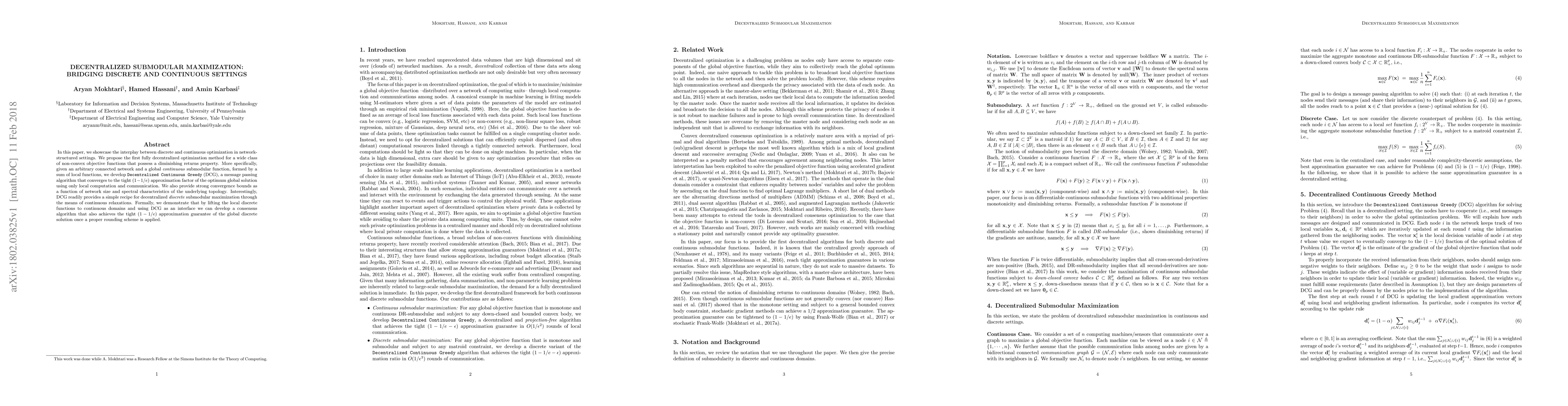 In this paper, we showcase the interplay between discrete and continuous optimization in network-structured settings. We propose the first fully decentralized optimization method for a wide class of non-convex objective functions that possess a diminishing returns property. More specifically, given an arbitrary connected network and a global continuous submodular function, formed by a sum of local functions, we develop Decentralized Continuous Greedy (DCG), a message passing algorithm that converges to the tight (1-1/e) approximation factor of the optimum global solution using only local computation and communication. We also provide strong convergence bounds as a function of network size and spectral characteristics of the underlying topology. Interestingly, DCG readily provides a simple recipe for decentralized discrete submodular maximization through the means of continuous relaxations. Formally, we demonstrate that by lifting the local discrete functions to continuous domains and using DCG as an interface we can develop a consensus algorithm that also achieves the tight (1-1/e) approximation guarantee of the global discrete solution once a proper rounding scheme is applied.