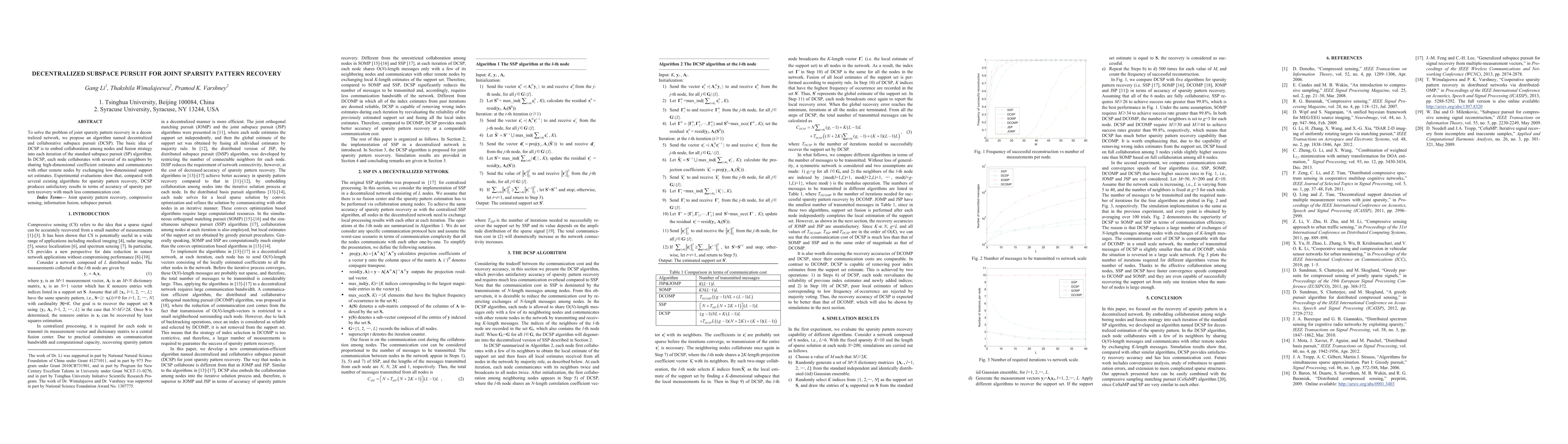The paper proposes a decentralized collaborative subspace pursuit (DCSP) algorithm for joint sparsity pattern recovery in networks, embedding collaboration and fusion strategies into the subspace pursuit method. DCSP achieves high accuracy with reduced communication costs compared to existing algorithms.