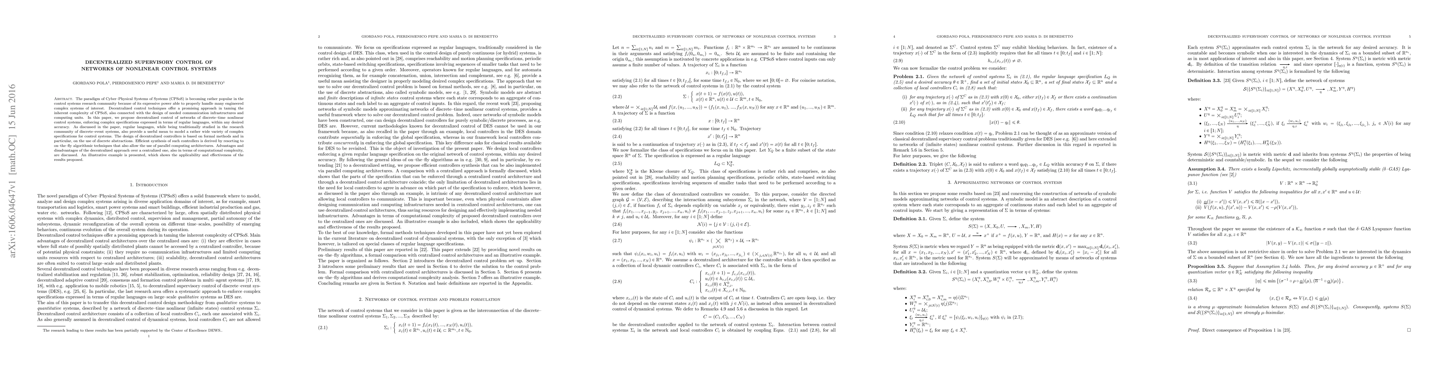 This paper proposes decentralized control techniques for networks of discrete-time nonlinear control systems, using regular languages to enforce complex specifications with desired accuracy. The decentralized approach leverages formal methods and on-the-fly algorithmic techniques for efficient controller synthesis, highlighting its advantages and disadvantages compared to centralized control.