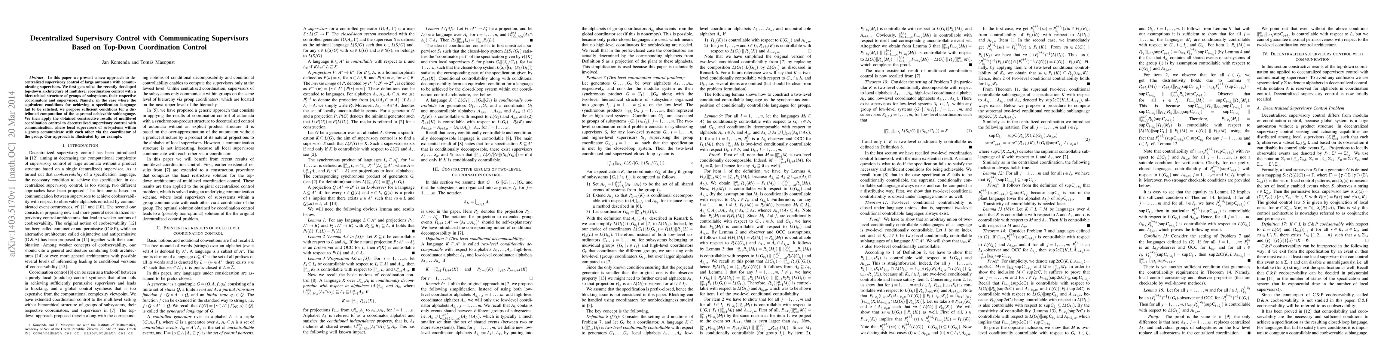In this paper we present a new approach to decentralized supervisory control of large automata with communicating supervisors. We first generalize the recently developed top-down architecture of multilevel coordination control with a hierarchical structure of groups of subsystems, their respective coordinators and supervisors. Namely, in the case where the equivalent conditions for achieving a specification language fail to be satisfied, we propose sufficient conditions for a distributed computation of the supremal achievable sublanguage. We then apply the obtained constructive results of multilevel coordination control to decentralized supervisory control with communication, where local supervisors of subsystems within a group communicate with each other via the coordinator of the group. Our approach is illustrated by an example.