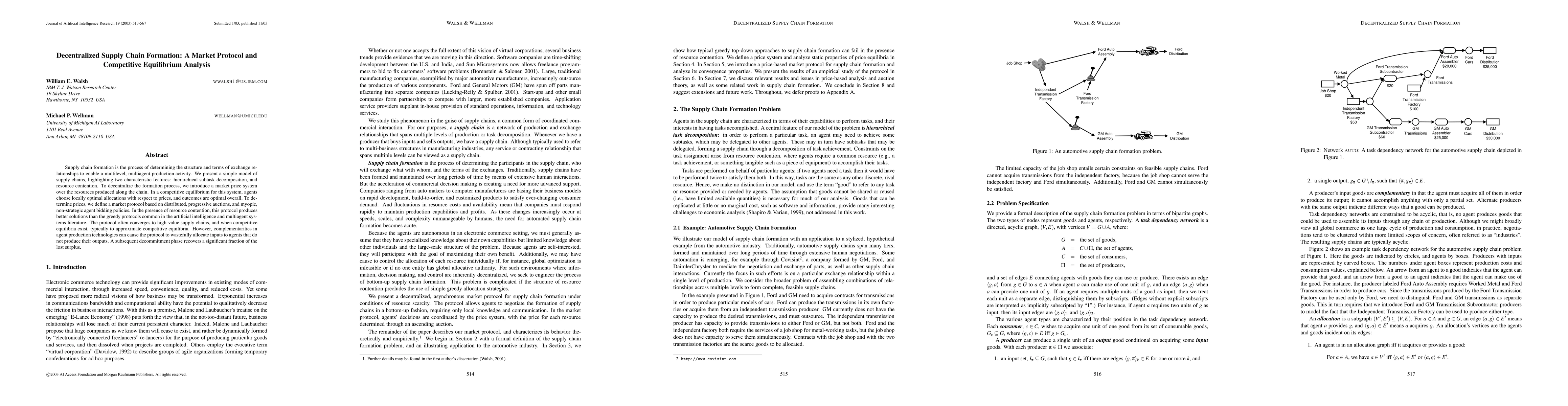 This paper proposes a decentralized market protocol for forming supply chains, utilizing distributed auctions to determine resource prices and achieve competitive equilibrium. The protocol often outperforms greedy methods, though it can misallocate resources due to technology complementarities, which are mitigated by a subsequent decommitment phase.
