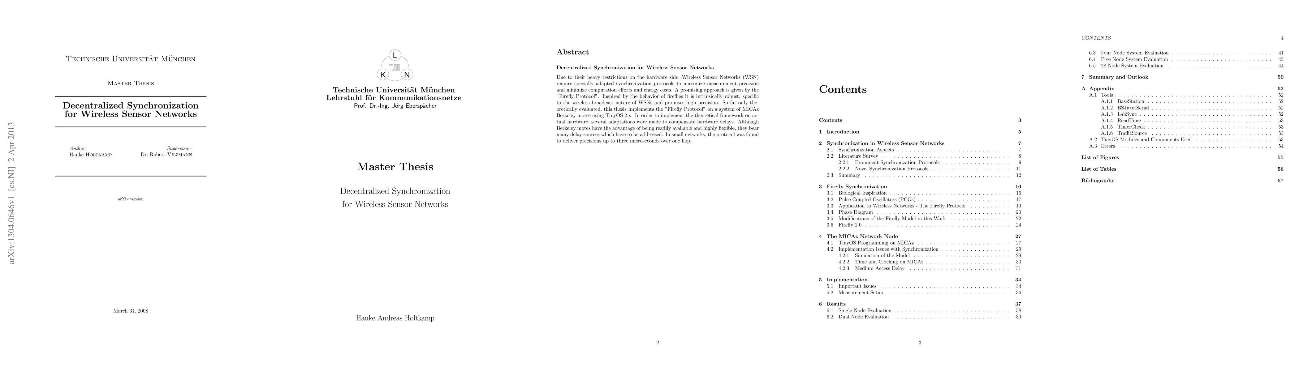 The work introduces a decentralized synchronization approach inspired by firefly behavior, which is inherently robust and specifically tailored to the wireless broadcast nature of WSNs, promising high precision with reduced computational efforts and energy costs.