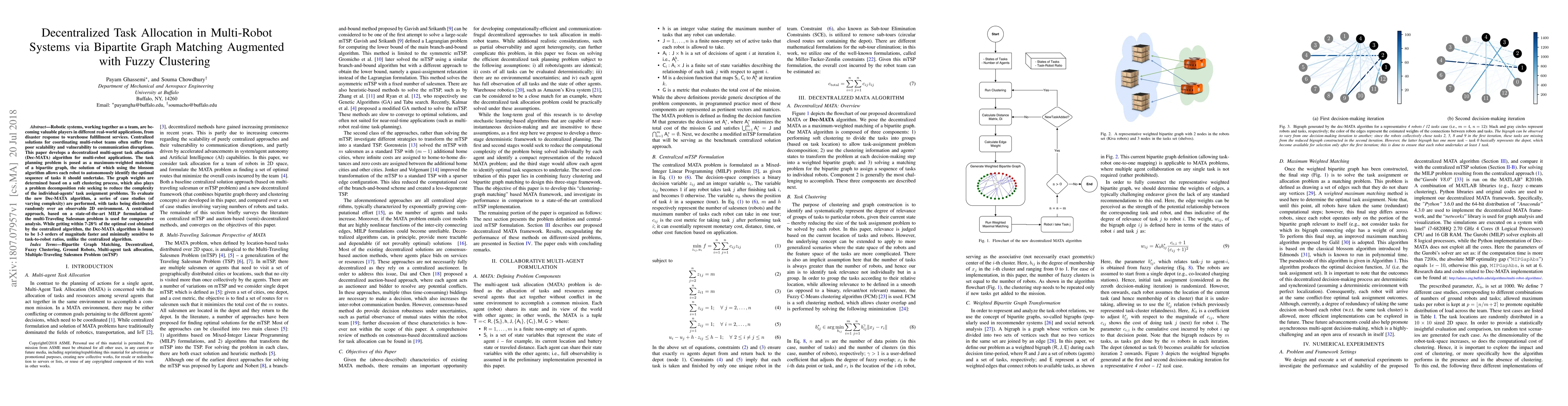 This paper proposes a decentralized multi-agent task allocation algorithm (Dec-MATA) for multi-robot systems, using a bipartite graph matching augmented with fuzzy clustering to enhance scalability and robustness. The Dec-MATA algorithm outperforms centralized MILP-based approaches in speed and scalability, achieving 7-28% of the optimal cost.