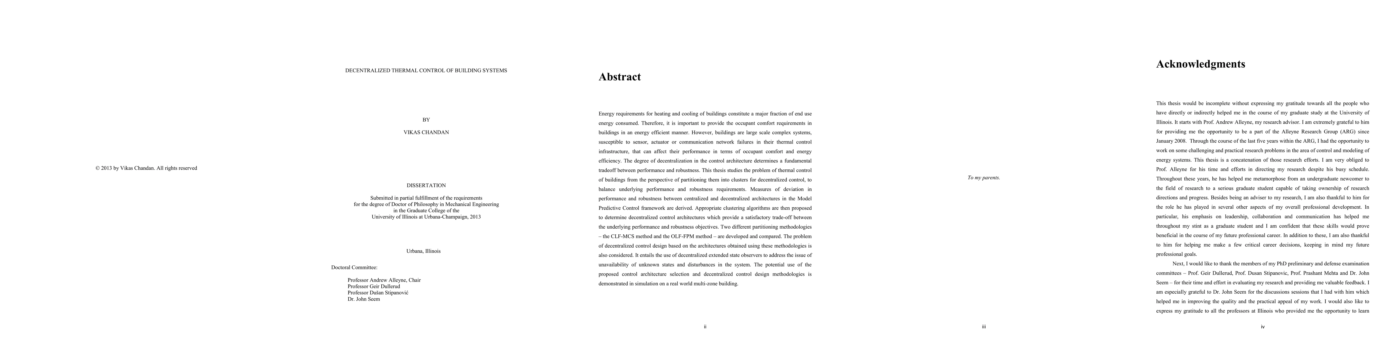 Energy requirements for heating and cooling of buildings constitute a major fraction of end use energy consumed. Therefore, it is important to provide the occupant comfort requirements in buildings in an energy efficient manner. However, buildings are large scale complex systems, susceptible to sensor, actuator or communication network failures in their thermal control infrastructure, that can affect their performance in terms of occupant comfort and energy efficiency. The degree of decentralization in the control architecture determines a fundamental tradeoff between performance and robustness. This thesis studies the problem of thermal control of buildings from the perspective of partitioning them into clusters for decentralized control, to balance underlying performance and robustness requirements. Measures of deviation in performance and robustness between centralized and decentralized architectures in the Model Predictive Control framework are derived. Appropriate clustering algorithms are then proposed to determine decentralized control architectures which provide a satisfactory trade-off between the underlying performance and robustness objectives. Two different partitioning methodologies the CLF-MCS method and the OLF-FPM method are developed and compared. The problem of decentralized control design based on the architectures obtained using these methodologies is also considered. It entails the use of decentralized extended state observers to address the issue of unavailability of unknown states and disturbances in the system. The potential use of the proposed control architecture selection and decentralized control design methodologies is demonstrated in simulation on a real world multi-zone building.