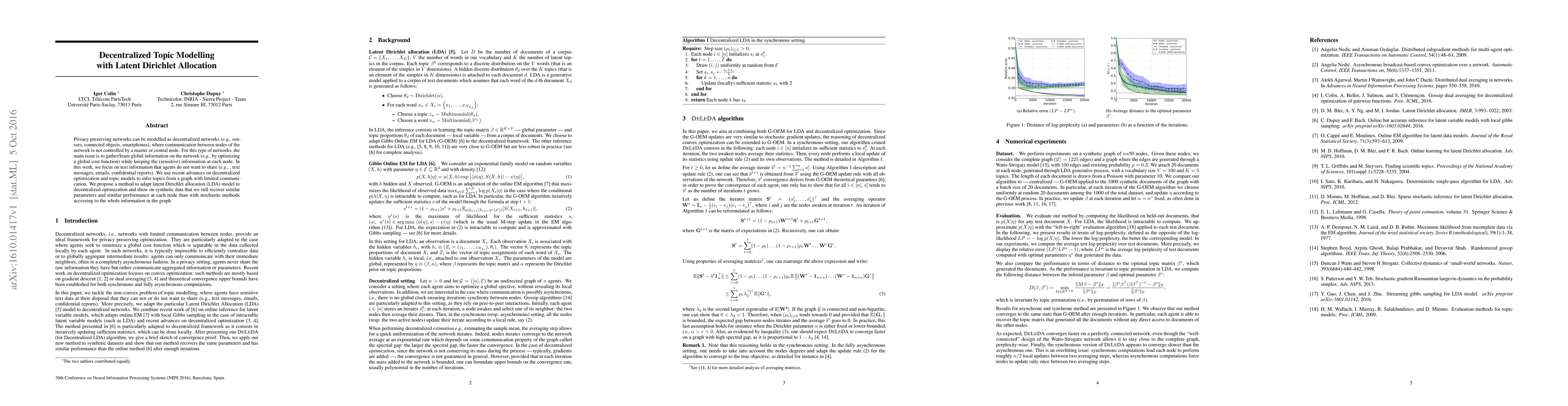 This paper proposes a decentralized adaptation of the Latent Dirichlet Allocation (LDA) model to infer topics in privacy-preserving networks where nodes communicate minimally. The method maintains similar performance and parameter recovery compared to traditional stochastic LDA methods, demonstrating effective decentralized topic modelling.