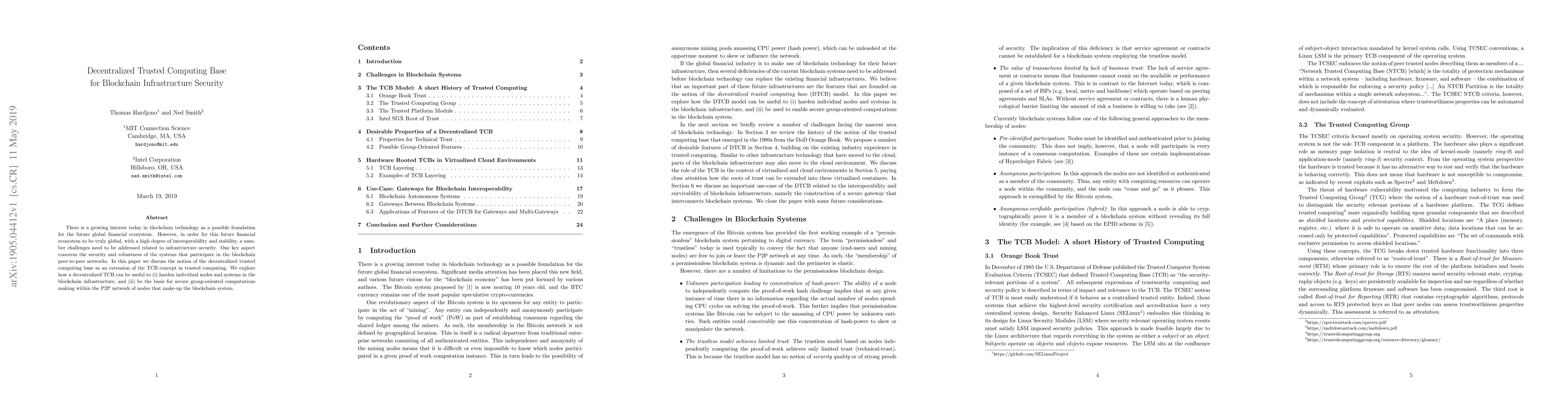 This paper explores the decentralized trusted computing base (DTCB) as a means to enhance security and robustness in blockchain infrastructure. It proposes the DTCB to secure individual nodes and enable secure group-oriented computations within the blockchain's peer-to-peer network.