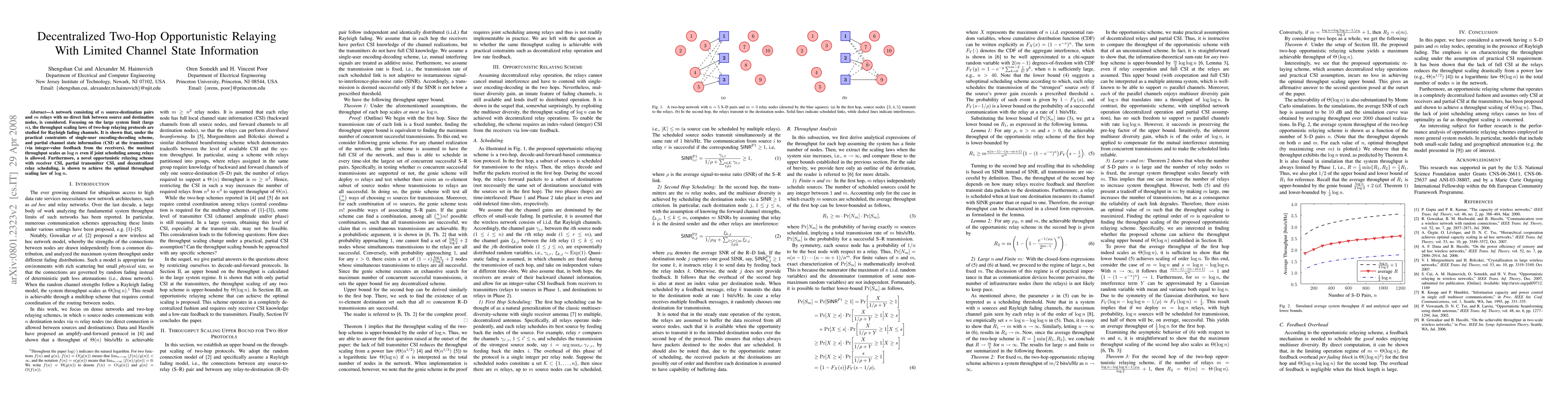 A network consisting of $n$ source-destination pairs and $m$ relays is considered. Focusing on the large system limit (large $n$), the throughput scaling laws of two-hop relaying protocols are studied for Rayleigh fading channels. It is shown that, under the practical constraints of single-user encoding-decoding scheme, and partial channel state information (CSI) at the transmitters (via integer-value feedback from the receivers), the maximal throughput scales as $\log n$ even if full relay cooperation is allowed. Furthermore, a novel decentralized opportunistic relaying scheme with receiver CSI, partial transmitter CSI, and no relay cooperation, is shown to achieve the optimal throughput scaling law of $\log n$.