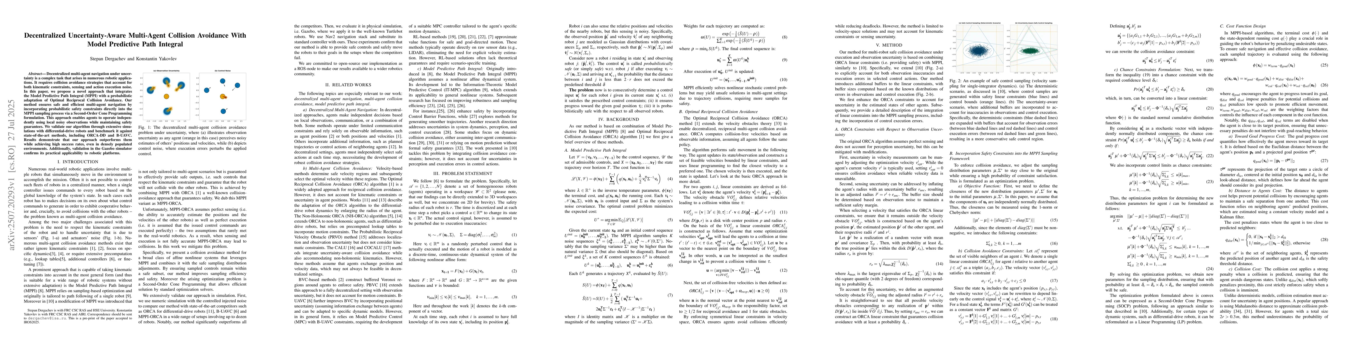 Decentralized multi-agent navigation under uncertainty is a complex task that arises in numerous robotic applications. It requires collision avoidance strategies that account for both kinematic constraints, sensing and action execution noise. In this paper, we propose a novel approach that integrates the Model Predictive Path Integral (MPPI) with a probabilistic adaptation of Optimal Reciprocal Collision Avoidance. Our method ensures safe and efficient multi-agent navigation by incorporating probabilistic safety constraints directly into the MPPI sampling process via a Second-Order Cone Programming formulation. This approach enables agents to operate independently using local noisy observations while maintaining safety guarantees. We validate our algorithm through extensive simulations with differential-drive robots and benchmark it against state-of-the-art methods, including ORCA-DD and B-UAVC. Results demonstrate that our approach outperforms them while achieving high success rates, even in densely populated environments. Additionally, validation in the Gazebo simulator confirms its practical applicability to robotic platforms.