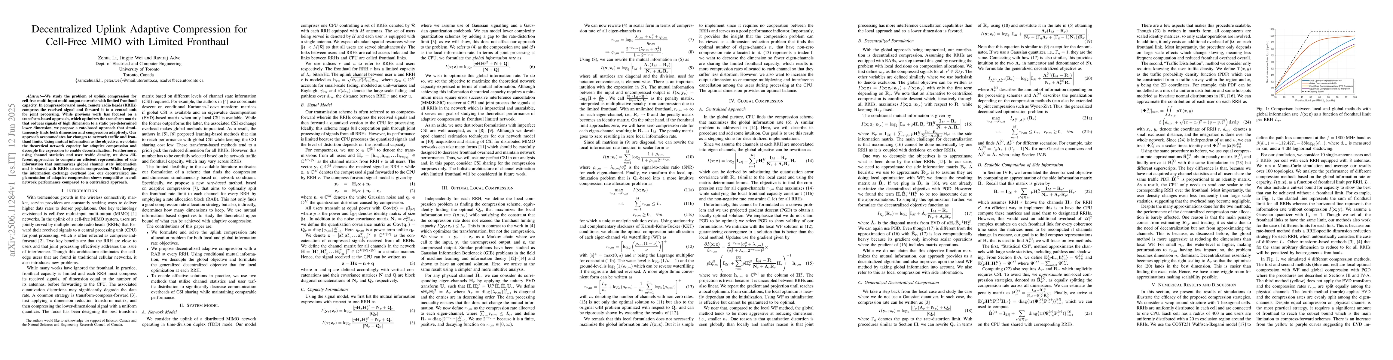 We study the problem of uplink compression for cell-free multi-input multi-output networks with limited fronthaul capacity. In compress-forward mode, remote radio heads (RRHs) compress the received signal and forward it to a central unit for joint processing. While previous work has focused on a transform-based approach, which optimizes the transform matrix that reduces signals of high dimension to a static pre-determined lower dimension, we propose a rate-based approach that simultaneously finds both dimension and compression adaptively. Our approach accommodates for changes to network traffic and fronthaul limits. Using mutual information as the objective, we obtain the theoretical network capacity for adaptive compression and decouple the expression to enable decentralization. Furthermore, using channel statistics and user traffic density, we show different approaches to compute an efficient representation of side information that summarizes global channel state information and is shared with RRHs to assist compression. While keeping the information exchange overhead low, our decentralized implementation of adaptive compression shows competitive overall network performance compared to a centralized approach.