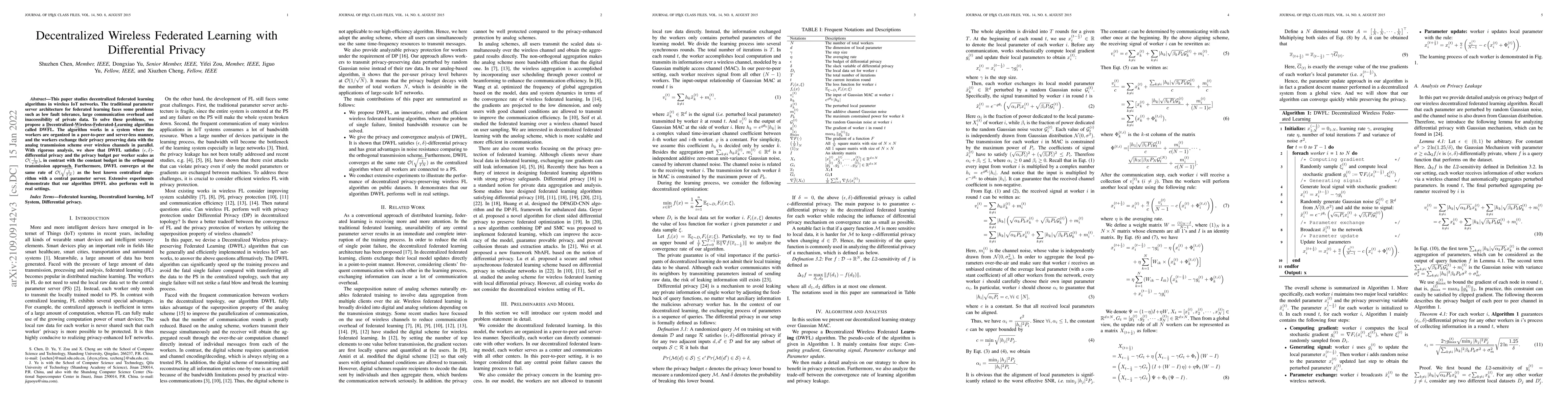 This paper proposes a Decentralized-Wireless-Federated-Learning (DWFL) algorithm for IoT networks that addresses issues like low fault tolerance and communication overhead in traditional federated learning methods. DWFL ensures $(\epsilon,\delta)$-differential privacy with a privacy budget scaling as $\mathcal{O}(\frac{1}{\sqrt{N}})$ and converges at the same rate as centralized algorithms.