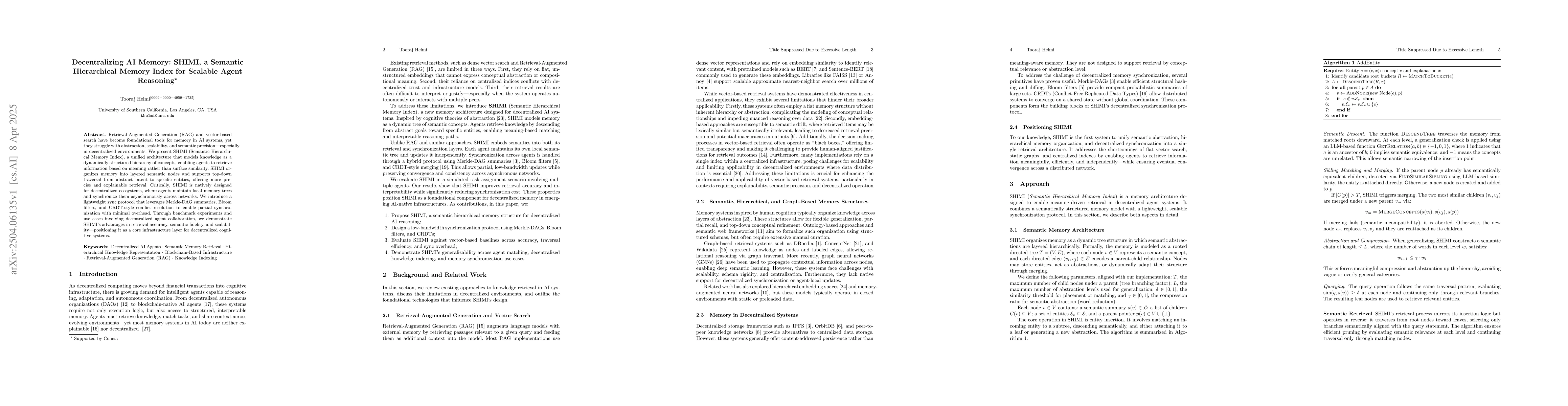 SHIMI is a Semantic Hierarchical Memory Index designed to enhance scalable agent reasoning in decentralized environments by organizing knowledge into a dynamic hierarchy of concepts for precise, explainable retrieval. It employs a lightweight sync protocol for efficient, minimal-overhead synchronization across decentralized networks.
