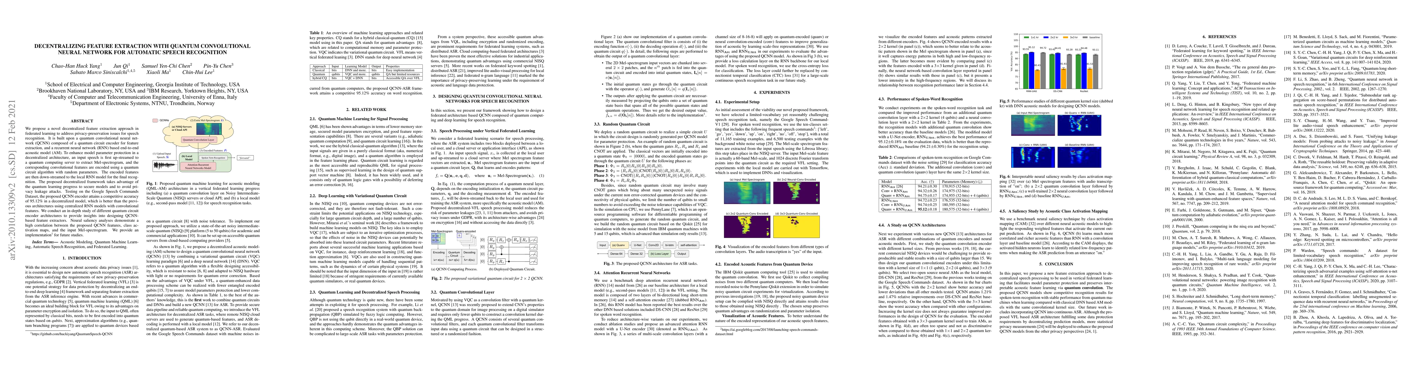 This paper proposes a decentralized feature extraction method using a quantum convolutional neural network (QCNN) for automatic speech recognition, achieving 95.12% accuracy on the Google Speech Commands Dataset. The approach leverages quantum circuits to encode features securely, enhancing privacy and model protection in federated learning.