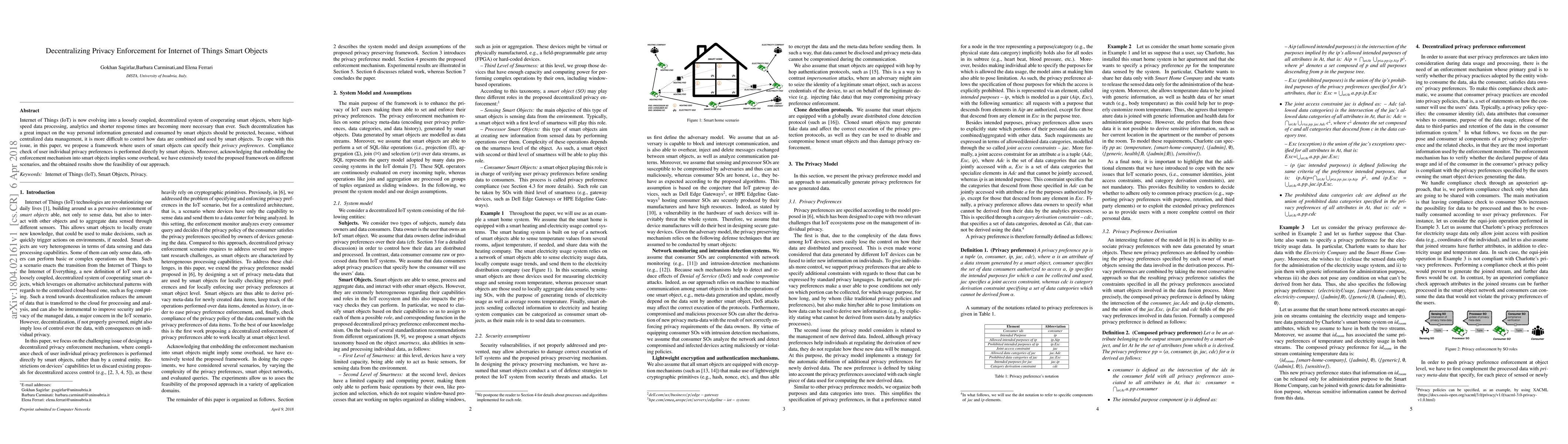This paper proposes a decentralized framework for enforcing privacy preferences in IoT smart objects, allowing users to specify their privacy preferences that are directly checked by the smart objects. The study demonstrates the feasibility of this approach through extensive testing across various scenarios.