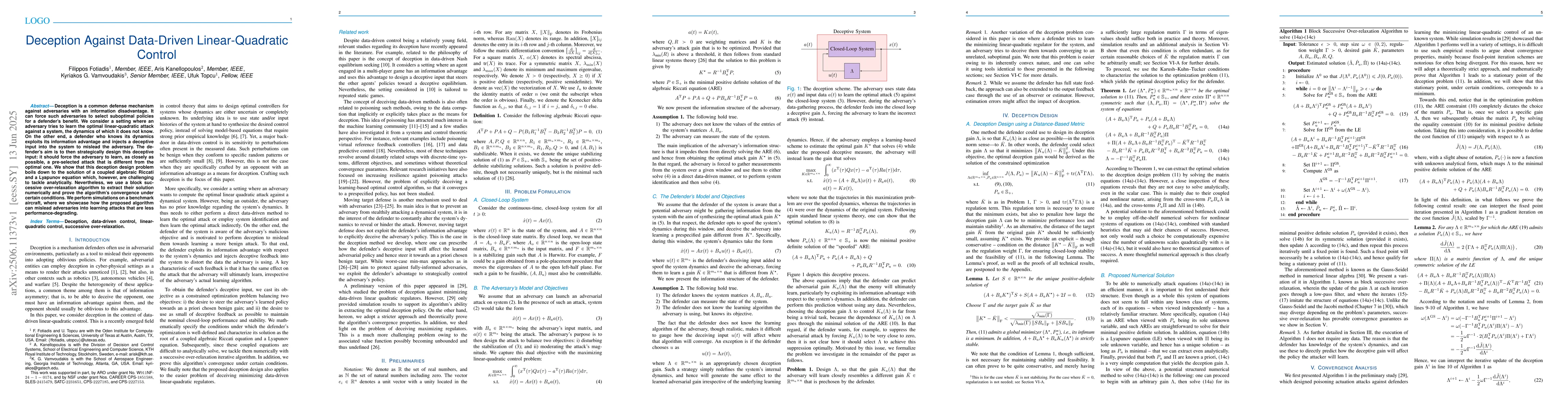 Deception is a common defense mechanism against adversaries with an information disadvantage. It can force such adversaries to select suboptimal policies for a defender's benefit. We consider a setting where an adversary tries to learn the optimal linear-quadratic attack against a system, the dynamics of which it does not know. On the other end, a defender who knows its dynamics exploits its information advantage and injects a deceptive input into the system to mislead the adversary. The defender's aim is to then strategically design this deceptive input: it should force the adversary to learn, as closely as possible, a pre-selected attack that is different from the optimal one. We show that this deception design problem boils down to the solution of a coupled algebraic Riccati and a Lyapunov equation which, however, are challenging to tackle analytically. Nevertheless, we use a block successive over-relaxation algorithm to extract their solution numerically and prove the algorithm's convergence under certain conditions. We perform simulations on a benchmark aircraft, where we showcase how the proposed algorithm can mislead adversaries into learning attacks that are less performance-degrading.
