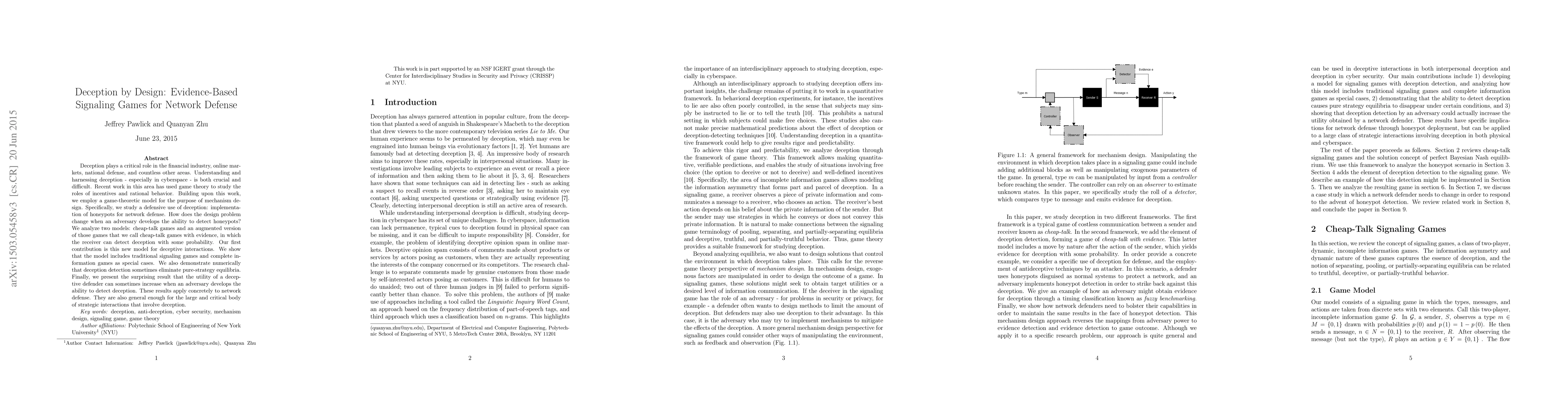 This paper develops a game-theoretic model for deceptive interactions, specifically focusing on honeypots for network defense. It introduces a new model called cheap-talk games with evidence, showing that deception detection can eliminate pure-strategy equilibria and sometimes increase the utility of a deceptive defender.