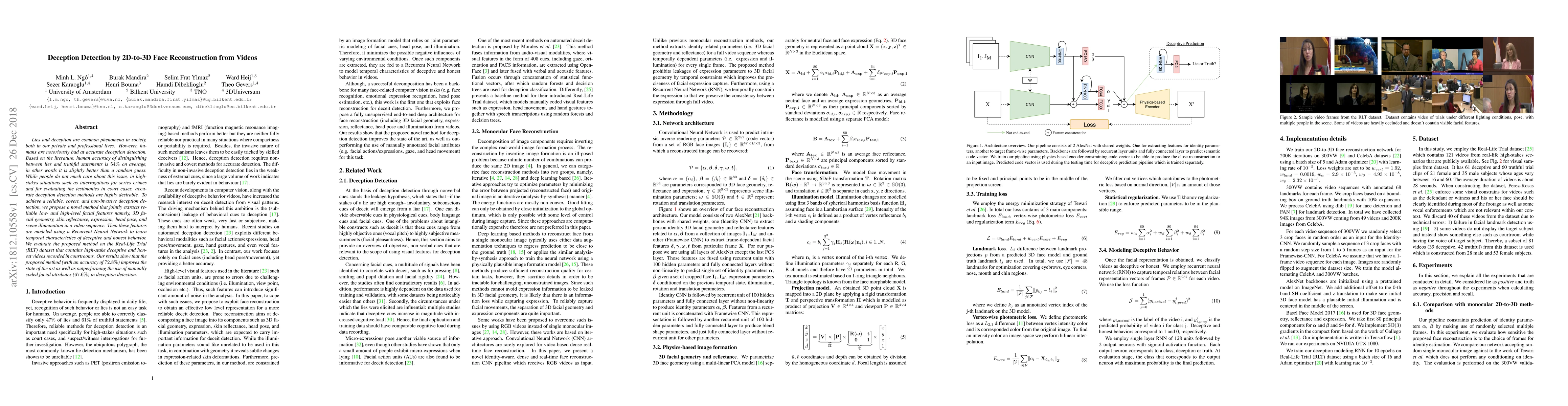 Lies and deception are common phenomena in society, both in our private and professional lives. However, humans are notoriously bad at accurate deception detection. Based on the literature, human accuracy of distinguishing between lies and truthful statements is 54% on average, in other words it is slightly better than a random guess. While people do not much care about this issue, in high-stakes situations such as interrogations for series crimes and for evaluating the testimonies in court cases, accurate deception detection methods are highly desirable. To achieve a reliable, covert, and non-invasive deception detection, we propose a novel method that jointly extracts reliable low- and high-level facial features namely, 3D facial geometry, skin reflectance, expression, head pose, and scene illumination in a video sequence. Then these features are modeled using a Recurrent Neural Network to learn temporal characteristics of deceptive and honest behavior. We evaluate the proposed method on the Real-Life Trial (RLT) dataset that contains high-stake deceptive and honest videos recorded in courtrooms. Our results show that the proposed method (with an accuracy of 72.8%) improves the state of the art as well as outperforming the use of manually coded facial attributes 67.6%) in deception detection.