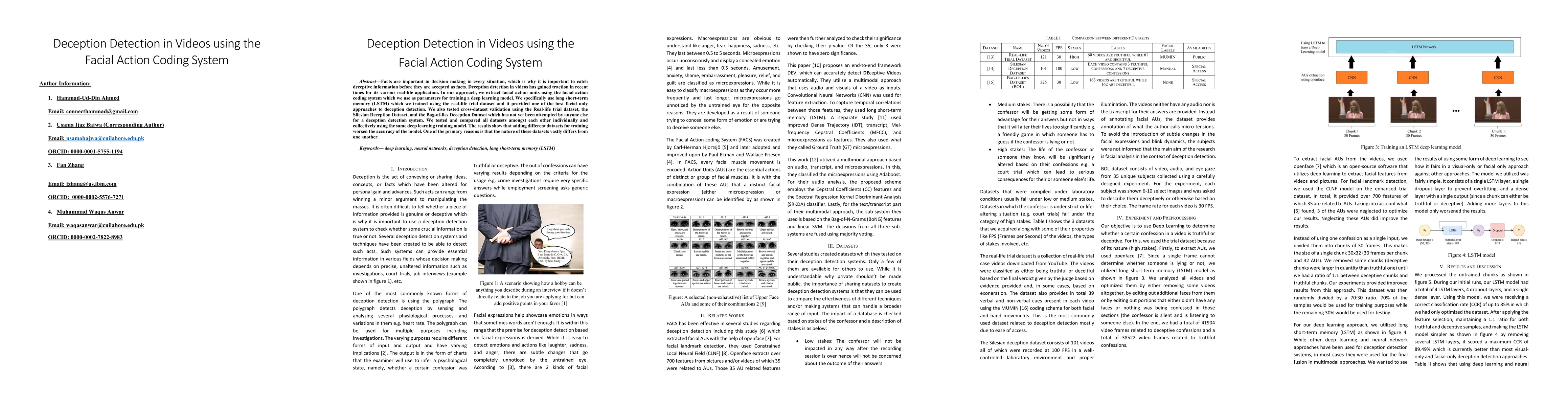 This paper proposes a deception detection method in videos using facial action units extracted via the Facial Action Coding System, trained with an LSTM deep learning model. Cross-dataset validation reveals that combining different datasets for training reduces model accuracy due to significant differences in dataset nature.
