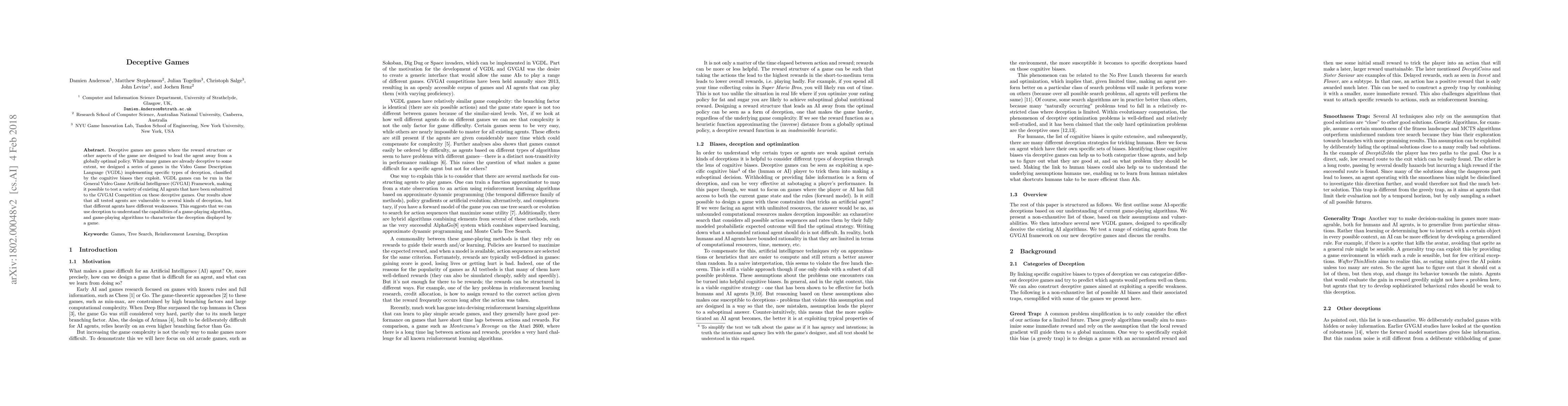 This paper designs deceptive games in VGDL to exploit cognitive biases and tests various AI agents within the GVGAI framework, revealing that all agents exhibit vulnerabilities to different types of deception, highlighting the potential of deception to assess algorithm capabilities.