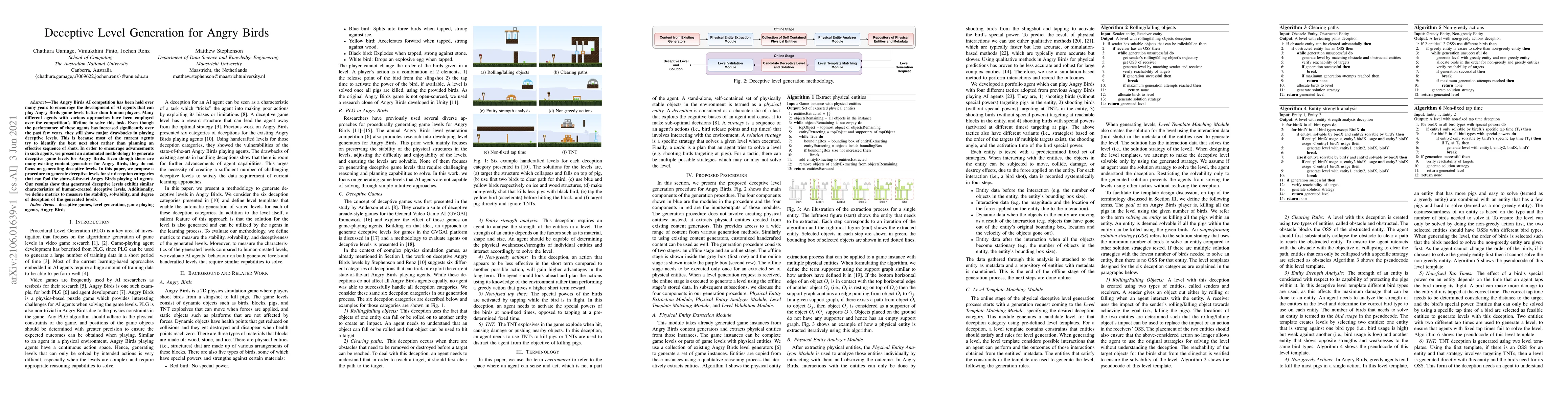 The paper proposes a procedure to generate deceptive levels for Angry Birds, including modules for physical entity extraction, analysis, template matching, and validation, along with a solution strategy generation.