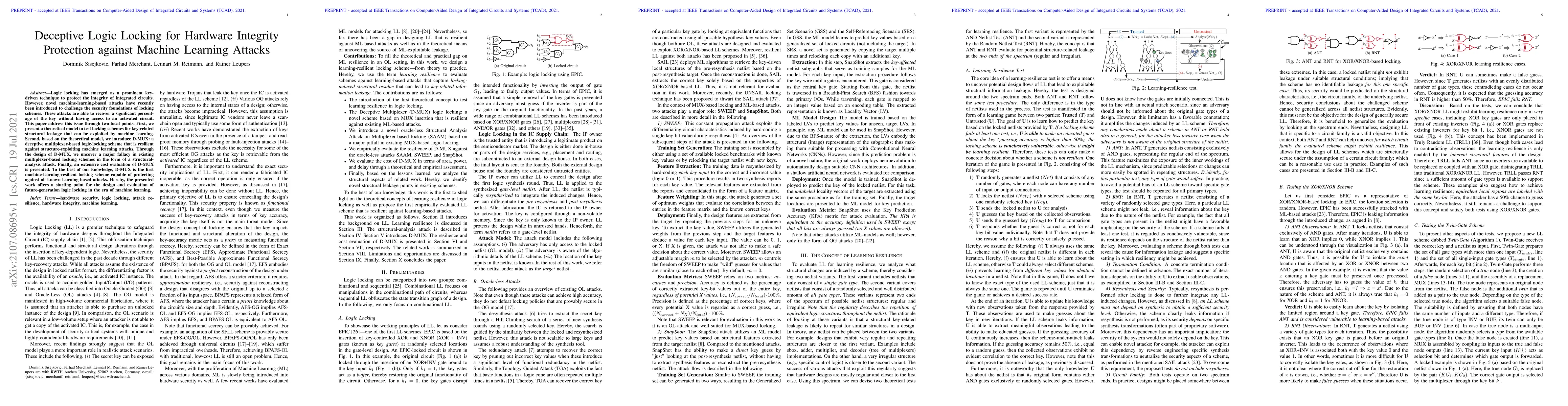 This paper introduces D-MUX, a novel deceptive logic-locking scheme designed to protect integrated circuits against machine learning attacks. It presents a theoretical model to identify vulnerabilities in existing schemes and demonstrates D-MUX's resilience, marking the first machine-learning-resilient locking scheme capable of thwarting all known learning-based attacks.