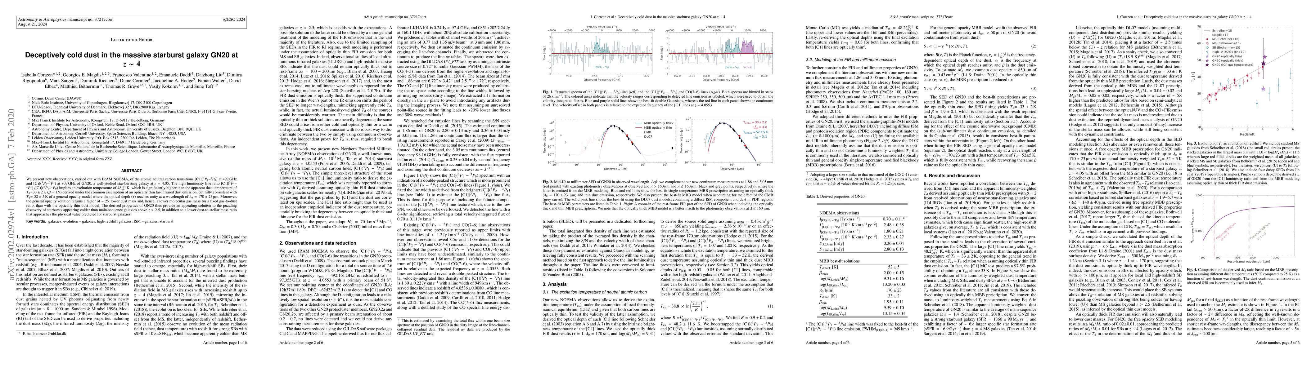 We present new observations, carried out with IRAM NOEMA, of the atomic neutral carbon transitions [CI](1-0) at 492 GHz and [CI](2-1) at 809 GHz of GN20, a well-studied star-bursting galaxy at $z=4.05$. The high luminosity line ratio [CI](2-1)/[CI](1-0) implies an excitation temperature of $48^{+14}_{-9}$ K, which is significantly higher than the apparent dust temperature of $T_{\rm d}=33\pm2$ K ($\beta=1.9$) derived under the common assumption of an optically thin far-infrared dust emission, but fully consistent with $T_{\rm d}=52\pm5$ K of a general opacity model where the optical depth ($\tau$) reaches unity at a wavelength of $\lambda_0=170\pm23$ $\mu$m. Moreover, the general opacity solution returns a factor of $\sim 2\times$ lower dust mass and, hence, a lower molecular gas mass for a fixed gas-to-dust ratio, than with the optically thin dust model. The derived properties of GN20 thus provide an appealing solution to the puzzling discovery of starbursts appearing colder than main-sequence galaxies above $z>2.5$, in addition to a lower dust-to-stellar mass ratio that approaches the physical value predicted for starburst galaxies.
