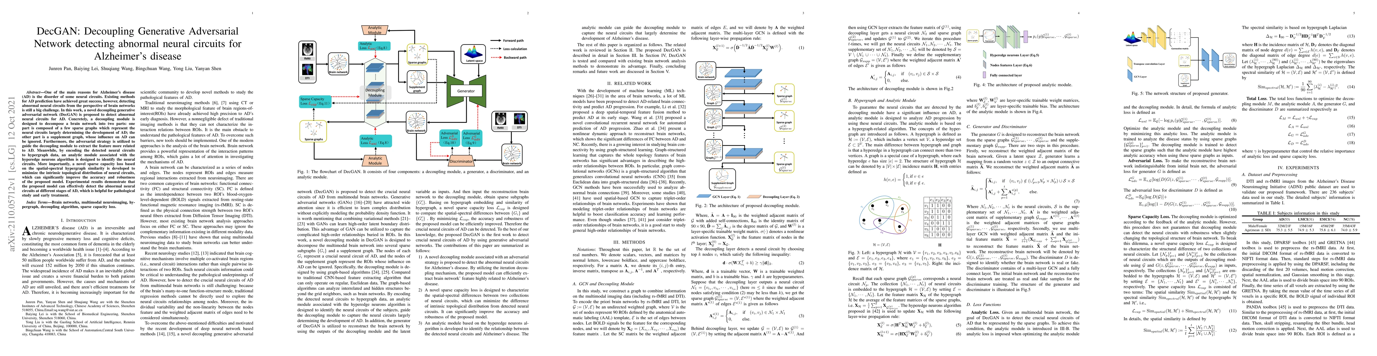 The paper proposes DecGAN, a novel decoupling generative adversarial network to detect abnormal neural circuits associated with Alzheimer's disease. The model decomposes brain networks to identify key circuits and uses adversarial training to enhance feature extraction, achieving improved accuracy and robustness in detecting AD-related abnormalities.