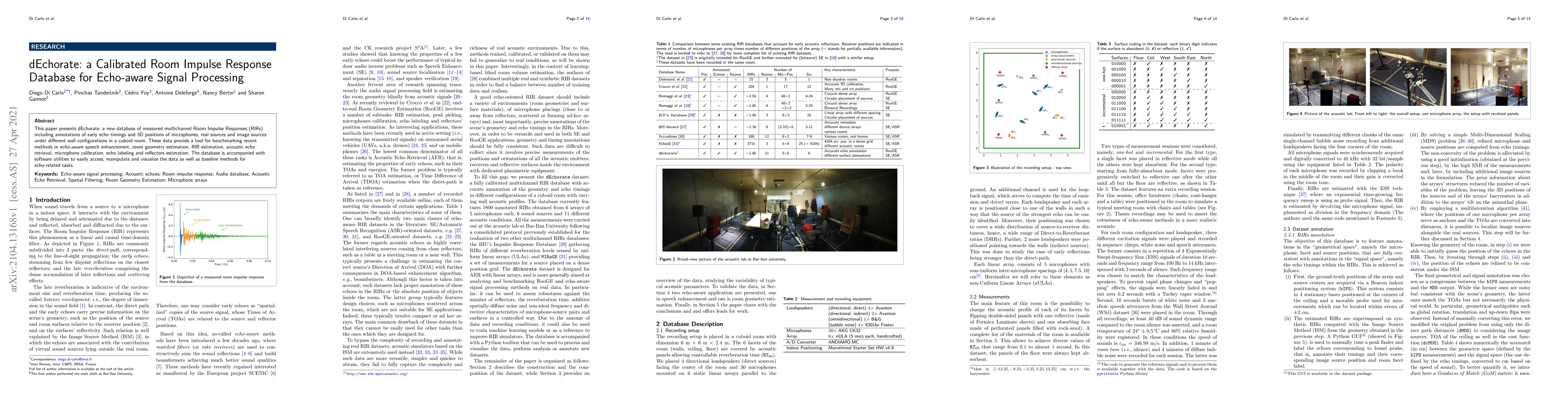 Summary: dEchorate is a new calibrated database of multichannel Room Impulse Responses with annotations for echo-related tasks, providing tools for benchmarking methods in echo-aware signal processing, and includes software utilities for data manipulation and visualization.