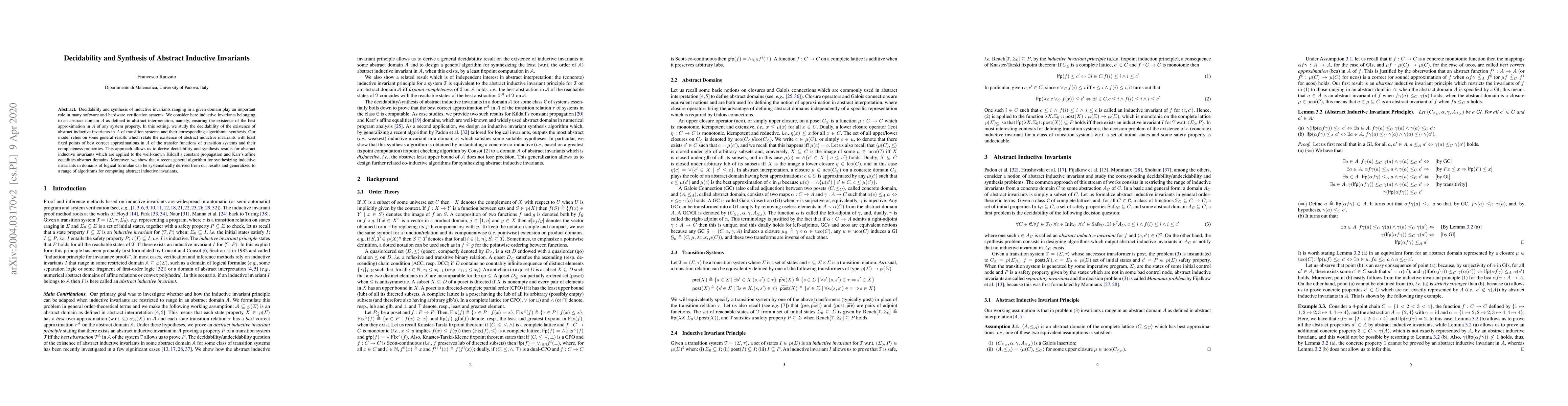 This paper explores the decidability and synthesis of abstract inductive invariants within abstract interpretation domains, demonstrating applicability to Kildall's constant propagation and Karr's affine equalities, and showing how a general algorithm for logical formulae can be derived from these results.