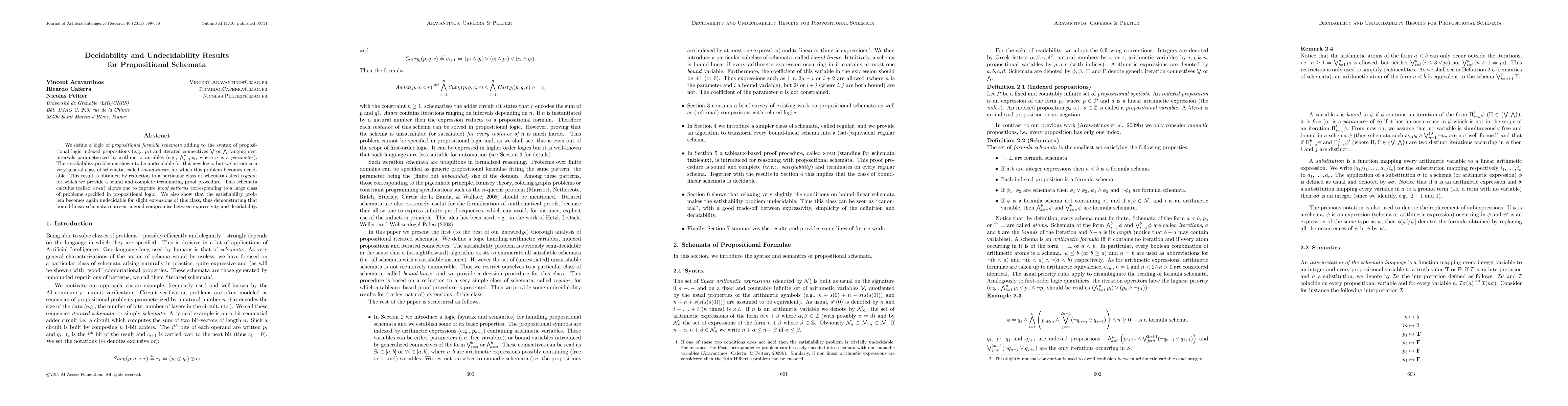 We define a logic of propositional formula schemata adding to the syntax of propositional logic indexed propositions and iterated connectives ranging over intervals parameterized by arithmetic variables. The satisfiability problem is shown to be undecidable for this new logic, but we introduce a very general class of schemata, called bound-linear, for which this problem becomes decidable. This result is obtained by reduction to a particular class of schemata called regular, for which we provide a sound and complete terminating proof procedure. This schemata calculus allows one to capture proof patterns corresponding to a large class of problems specified in propositional logic. We also show that the satisfiability problem becomes again undecidable for slight extensions of this class, thus demonstrating that bound-linear schemata represent a good compromise between expressivity and decidability.
