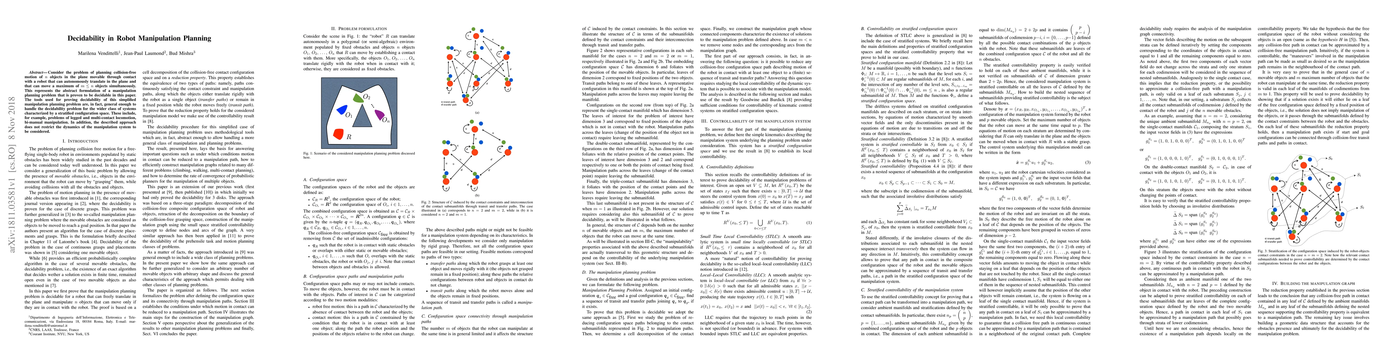 This paper proves the decidability of planning collision-free motion for a robot manipulating up to $m \leq n$ objects in a plane, using methods that extend to broader manipulation scenarios like legged locomotion and bi-manual tasks. The approach accommodates various system dynamics without restrictions.