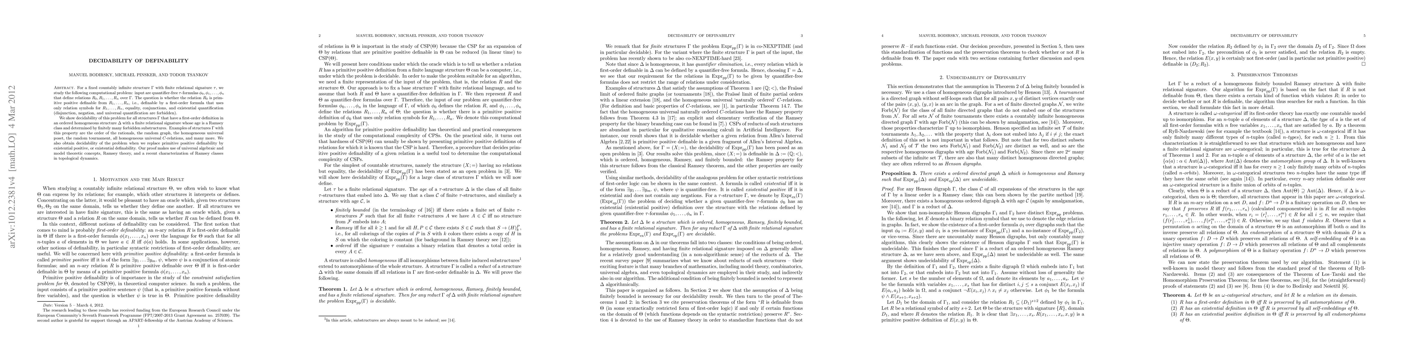 This paper investigates the decidability of a computational problem concerning the primitive positive definability of relations in countably infinite structures. It establishes decidability for structures defined in ordered homogeneous structures with Ramsey class properties, using algebraic, model-theoretic, and Ramsey theory methods.
