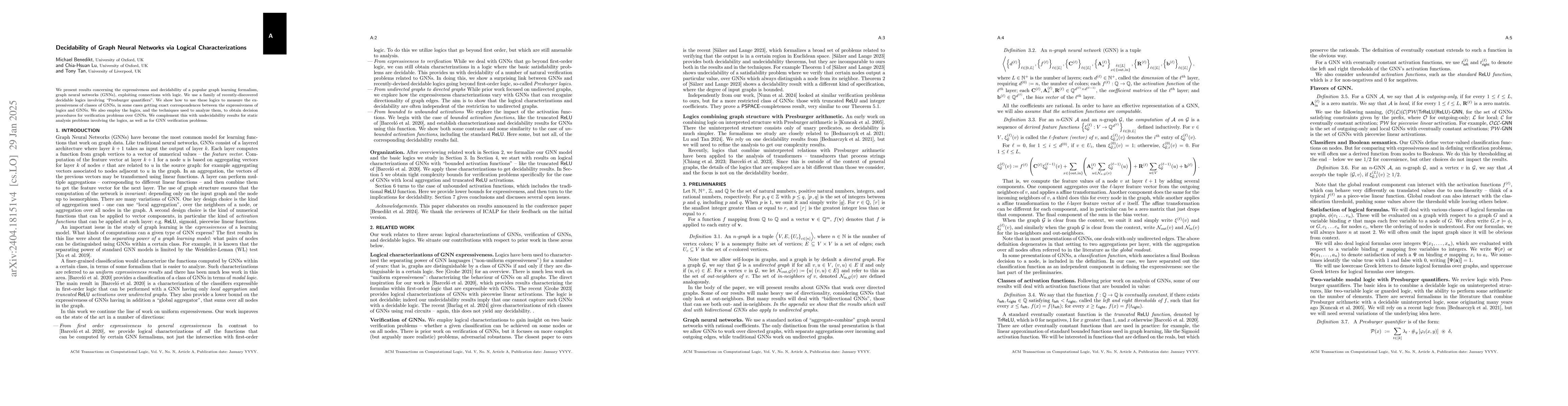 This paper investigates the expressiveness and decidability of graph neural networks (GNNs) using decidable logics with Presburger quantifiers. It establishes exact correspondences between the logics and GNNs' expressiveness, provides decision procedures for GNN verification, and presents undecidability results for static analysis and verification problems.